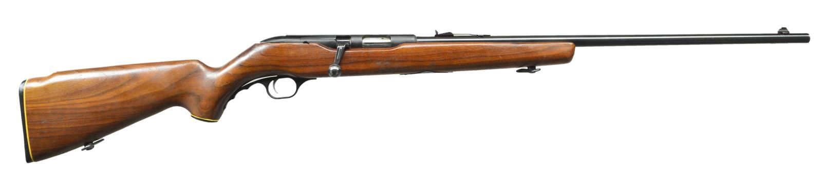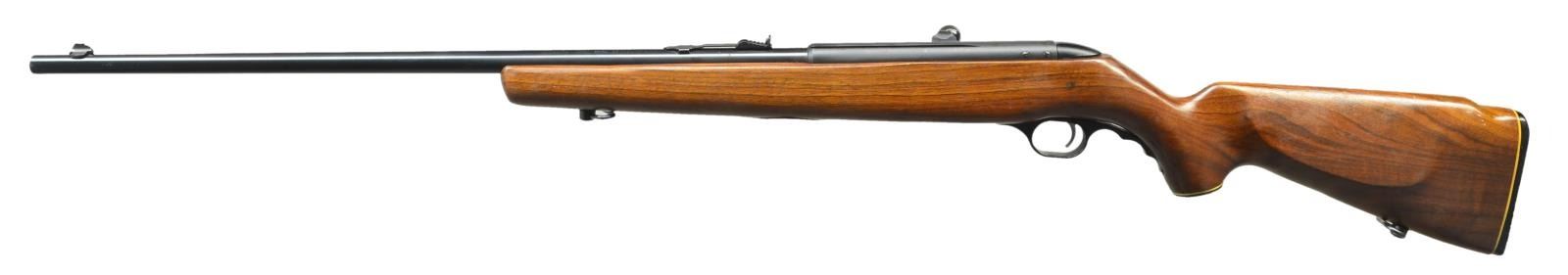 Cal. 22 MAGNUM. S# NSN. Bbl. 24" Mfg.1961-1963. Single shot, bolt action rimfire target rifle. Satin blued finish on exposed metal surfaces. Fixed blade front sight w/ elevation adjustable rear sight. Factory dove-tailed receier. Hardwood Monte Carlo style stock w. sling swivels front & rear. Checkered, black plastic grip cap & buttplate w/ white spacers. Plastic finger grooves integral w/ trigger guard. CONDITION: Blued finish enjoys complete & consistent coverage w/ very little sign of use or wear. Some light patina spotting brought under control early. Bright bore w/ descent rifling. (22-3941/JZ). CURIO. $200-400