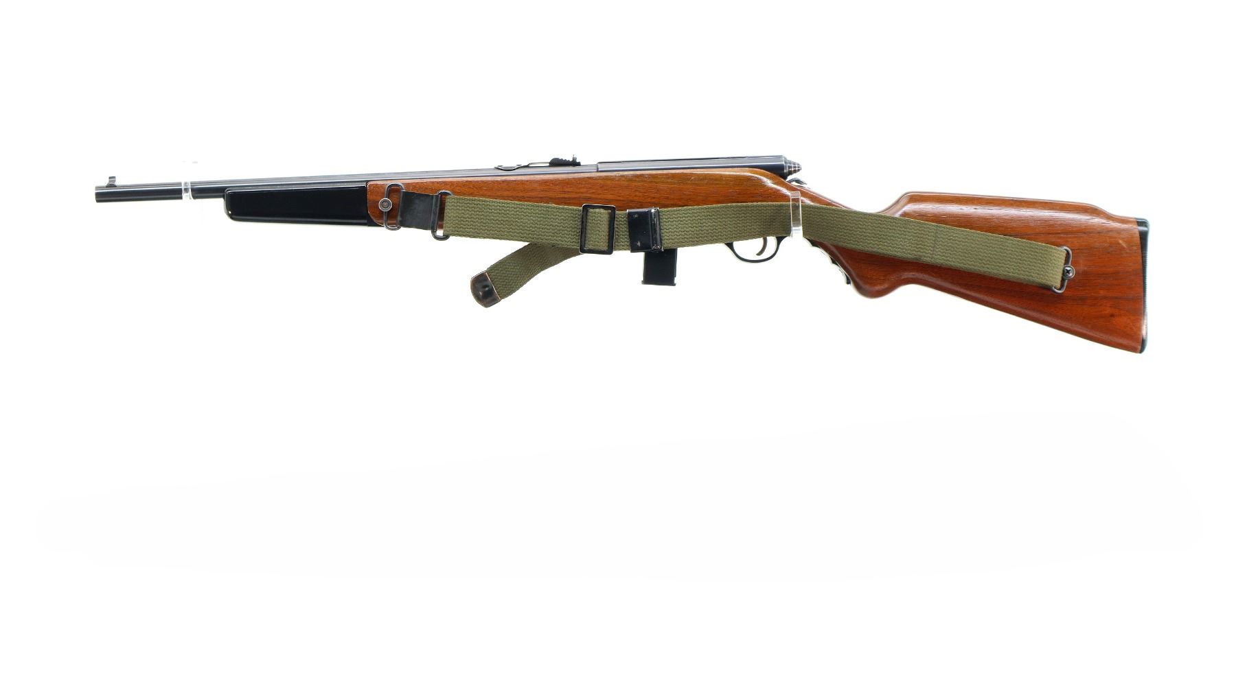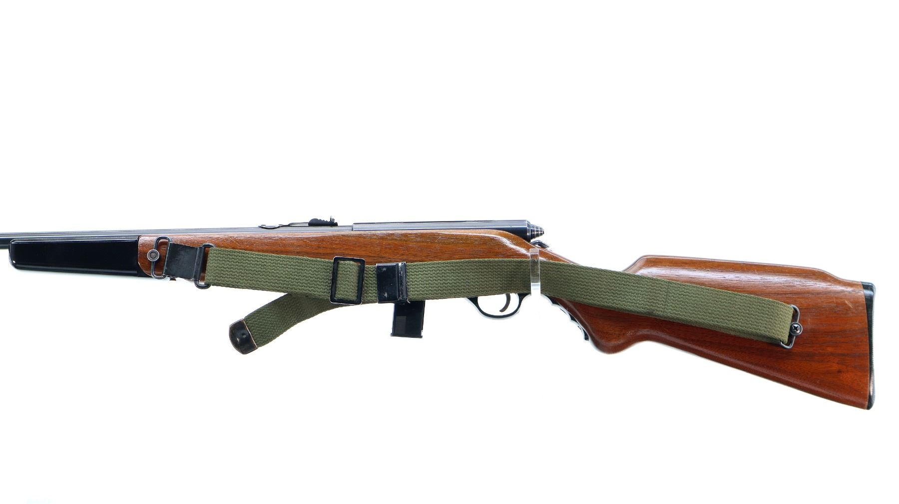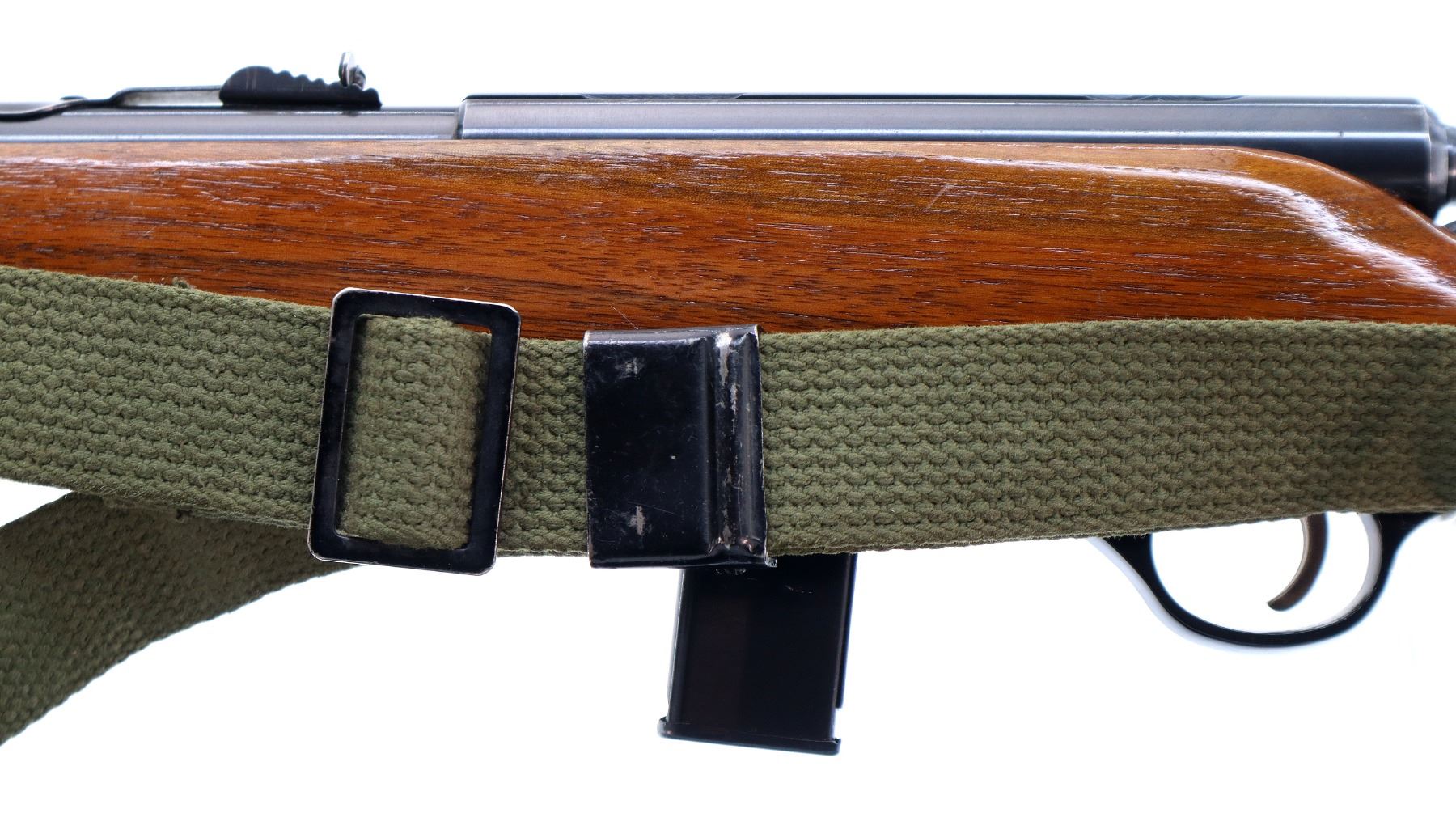 Main Description: Blade front sight, adjustable u notched rear sight, blued finish, grooved receiver and bolt knob, safety buttons are present, folding black polymer front grip. One piece wood stock, pistol grip cracked behind receiver, grooved black polymer butt plate, sling swivels with green canvas military sling.