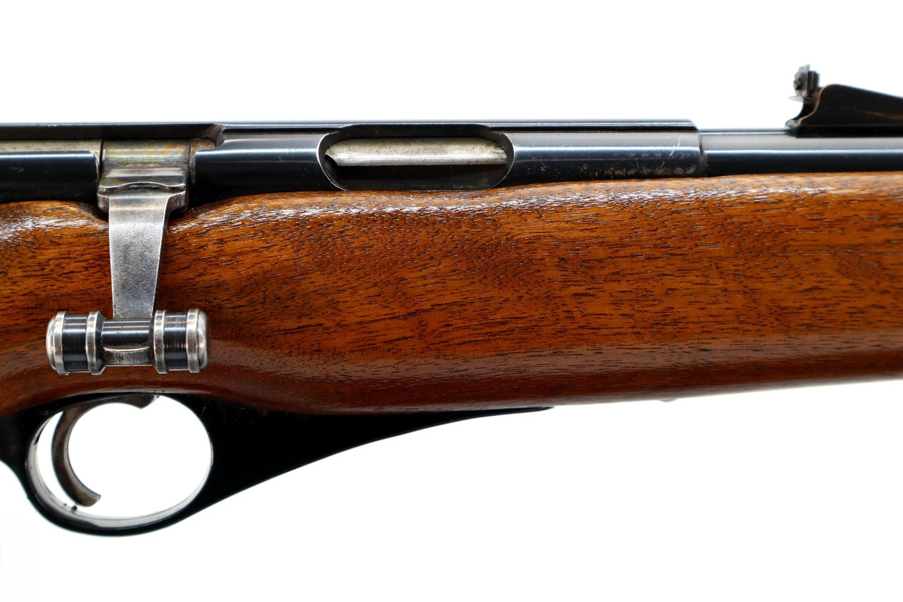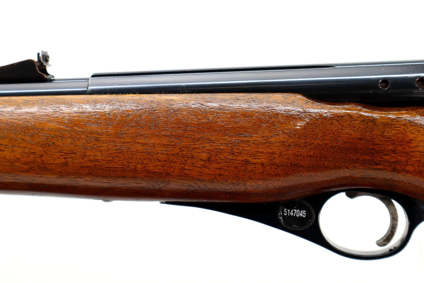 Main Description: Post front sight with ramp, adjustable u notched rear sight, blued finish, grooved receiver, round double sided bolt handle, safety buttons are present. One piece wood stock, pistol grip, cheek rest, grooved black polymer butt plate, stock is chipped and cracked on right side, swivel studs.