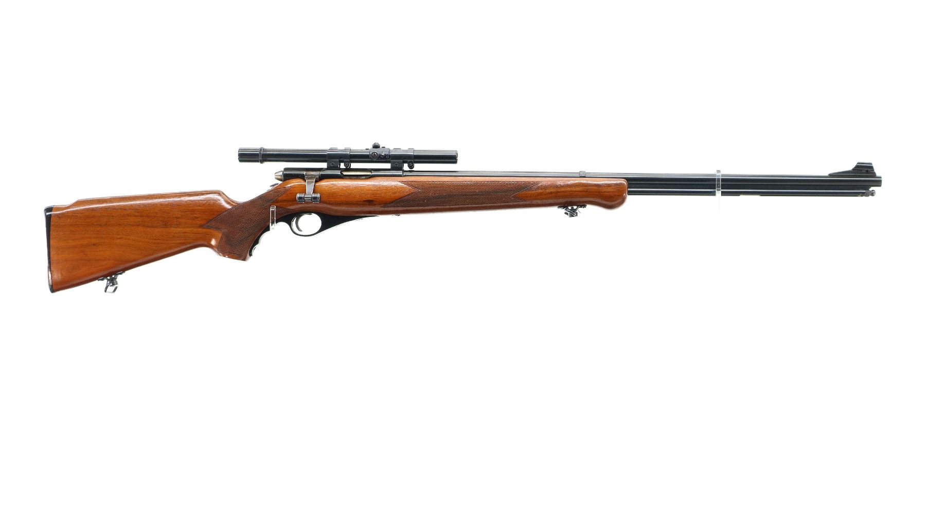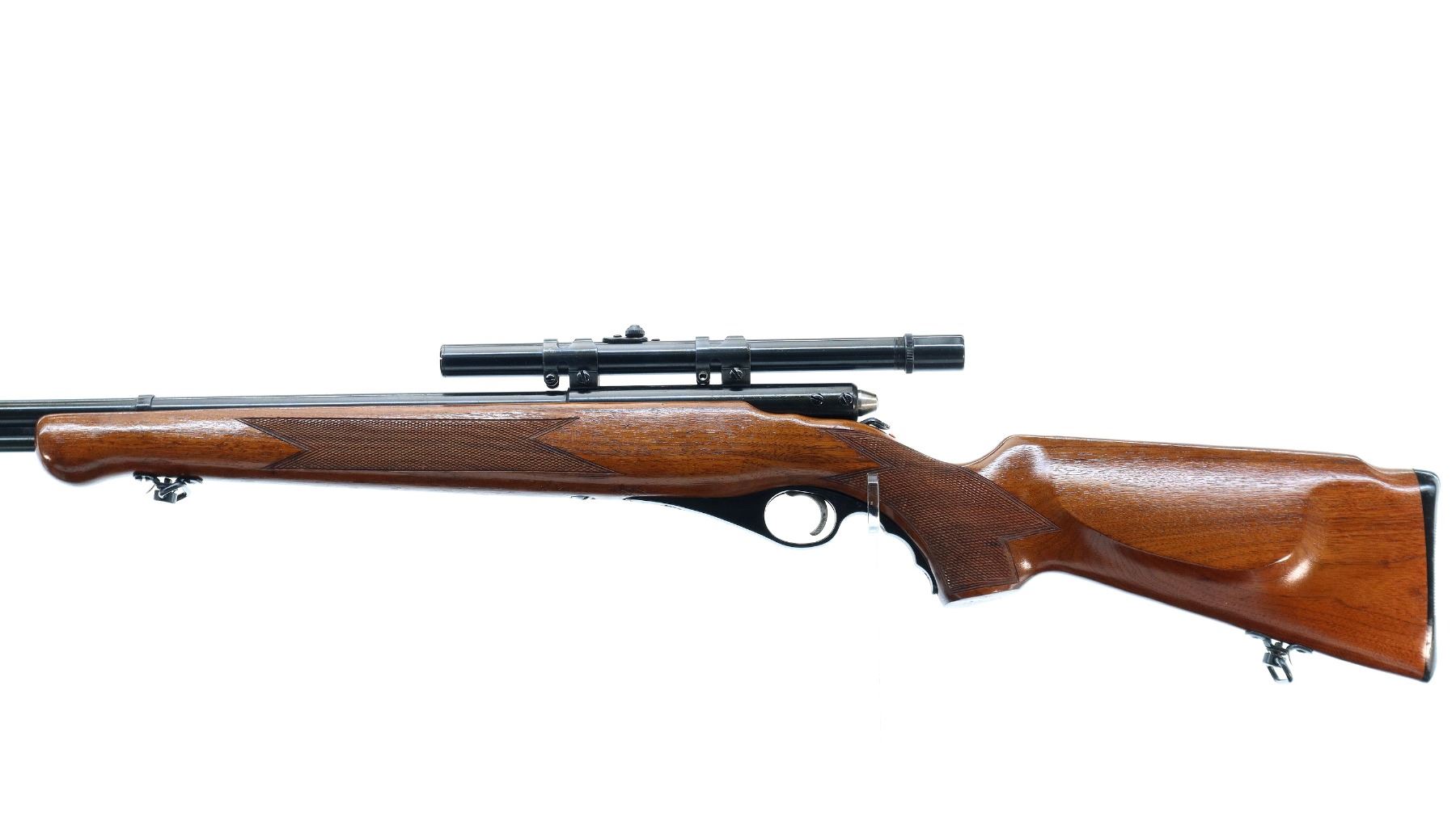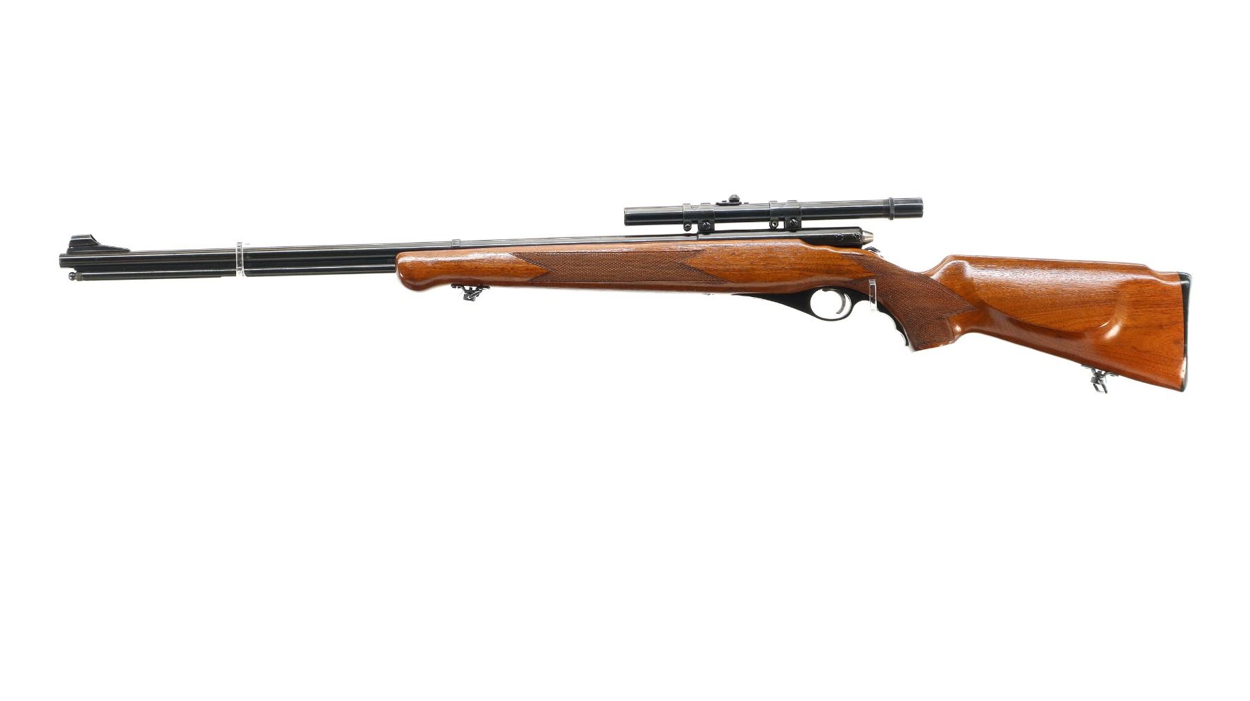 Main Description: Post front sight with hood and ramp, missing rear sight threaded holes are present, blued finish, grooved receiver with Weaver G4 scope installed, clear optics, fine crosshair, rear mount missing one screw. One piece wood stock, checkered forearm and pistol grip, retains safety buttons, cheek rest, grooved black polymer butt plate, trigger guard has a slight gap, sling swivels, full length magtube.