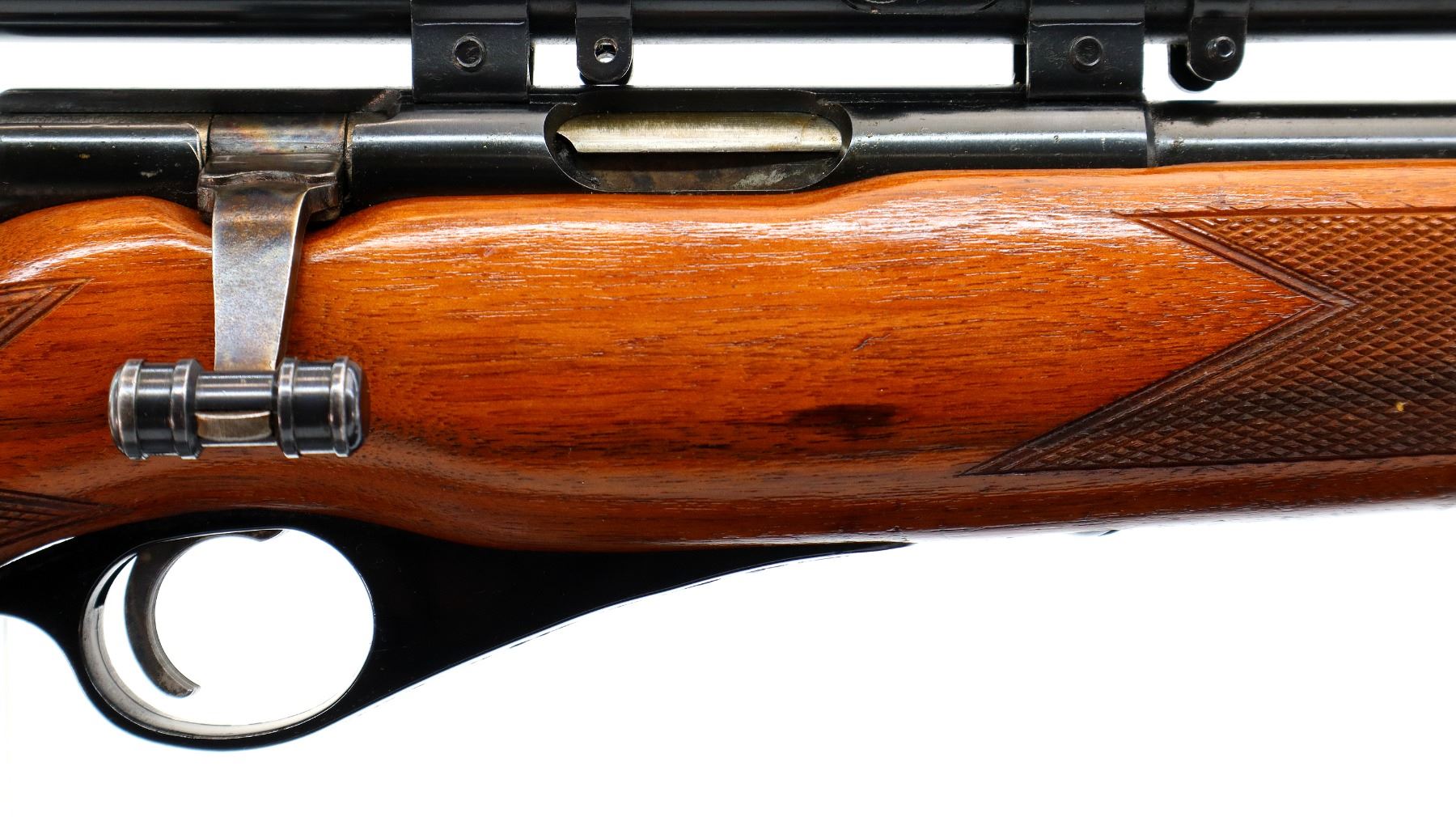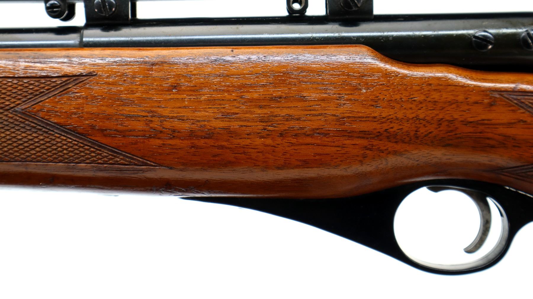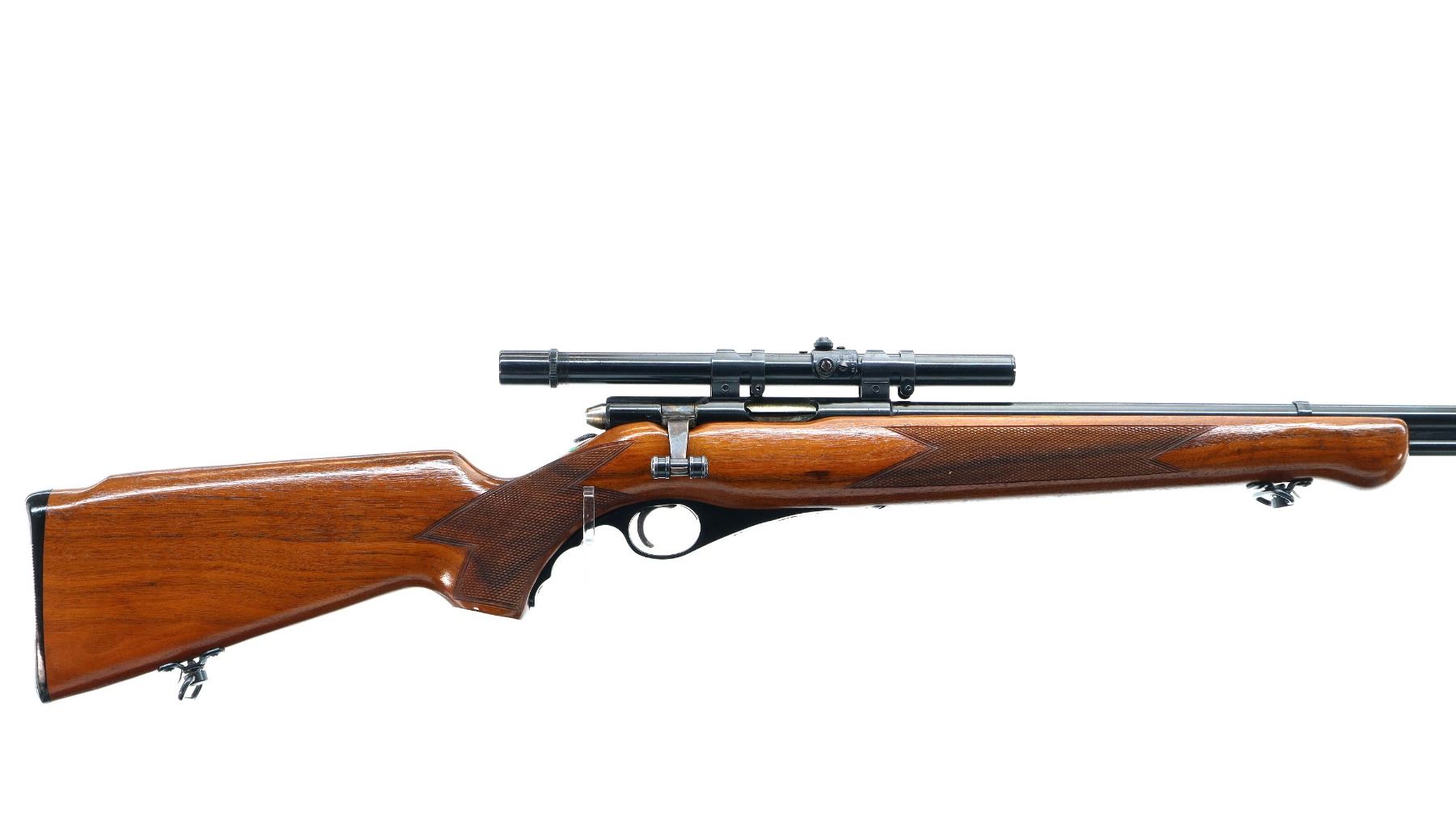 Main Description: Post front sight with hood and ramp, missing rear sight threaded holes are present, blued finish, grooved receiver with Weaver G4 scope installed, clear optics, fine crosshair, rear mount missing one screw. One piece wood stock, checkered forearm and pistol grip, retains safety buttons, cheek rest, grooved black polymer butt plate, trigger guard has a slight gap, sling swivels, full length magtube.