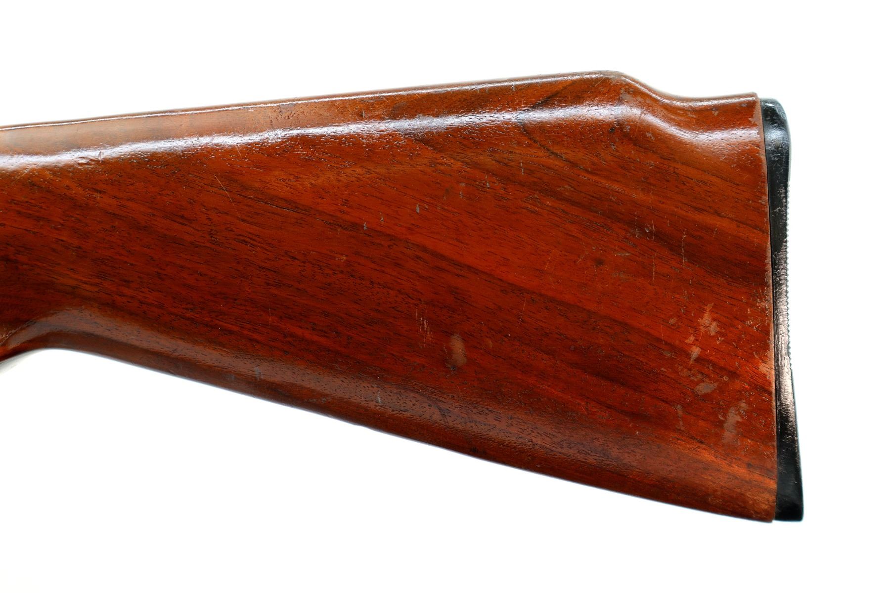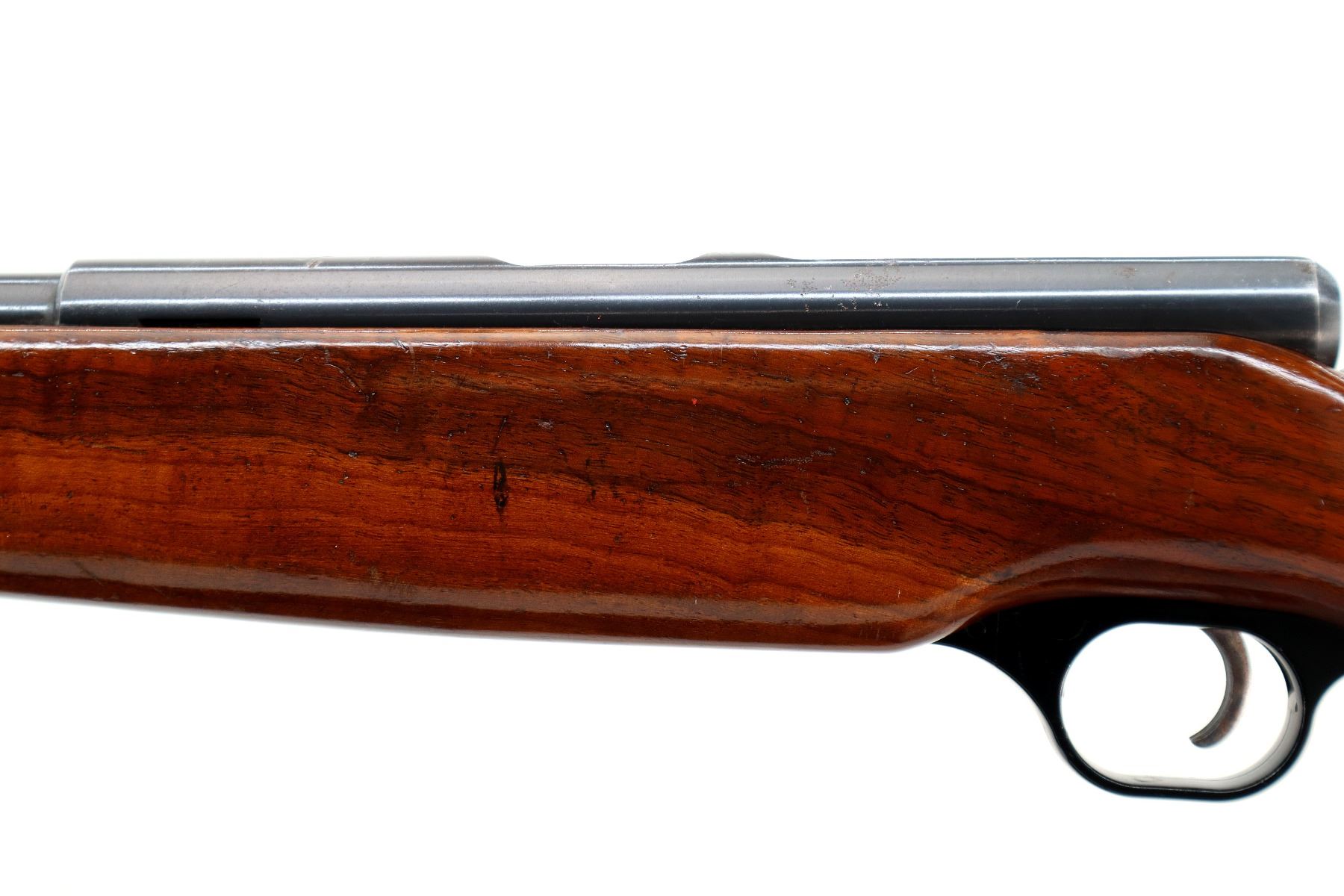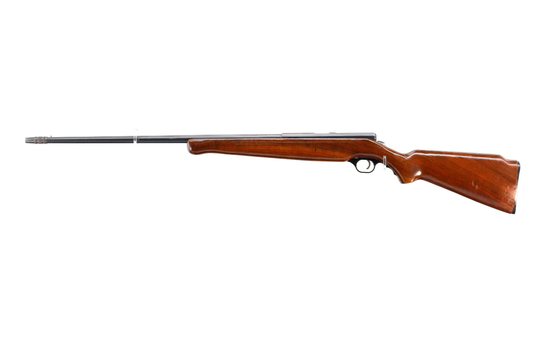 Main Description: Silver bead, blued finish, round barrel, grooved bolt knob, safety buttons are present. One piece wood stock, pistol grip, grooved black polymer butt plate, trigger guard has a slight gap between the stock.