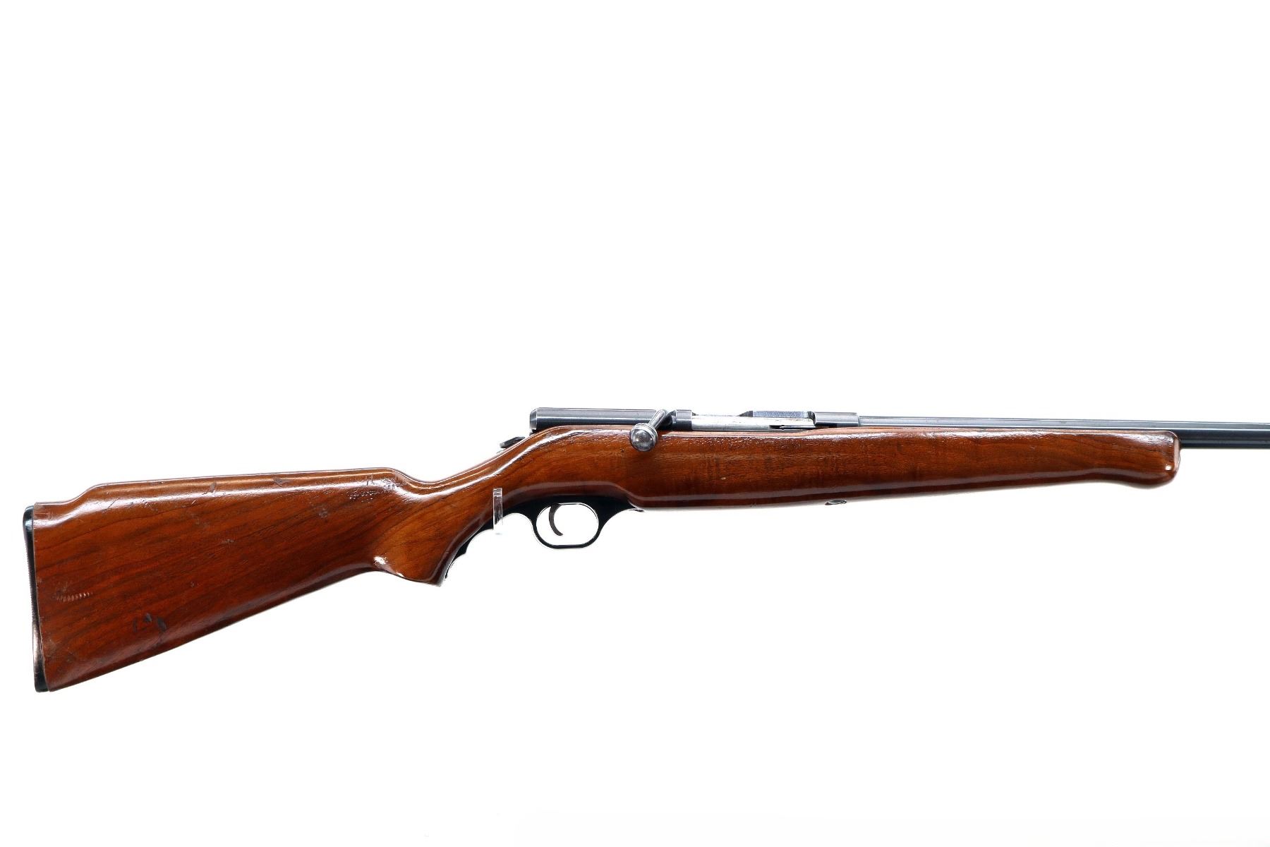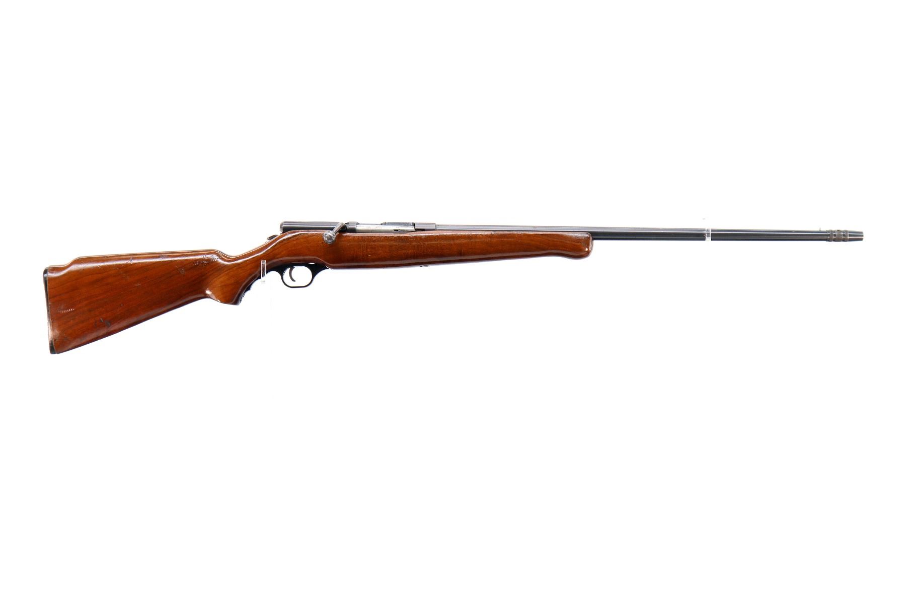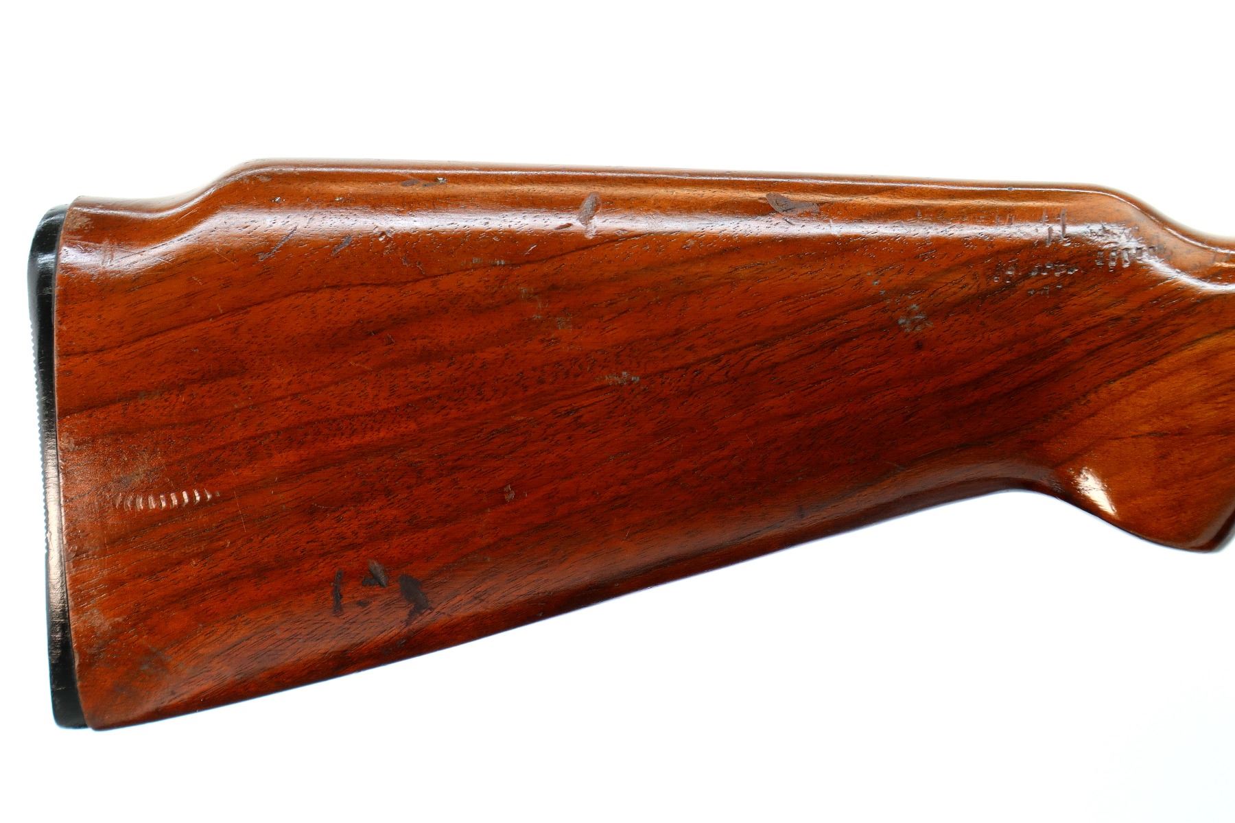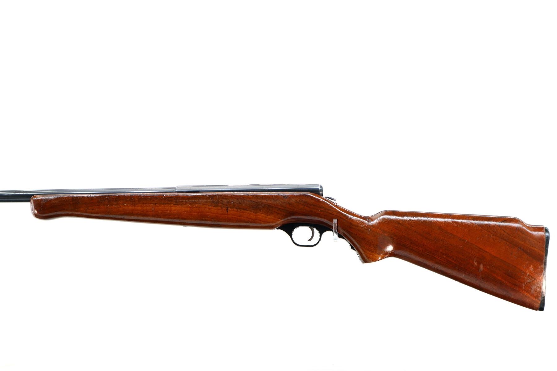 Main Description: Silver bead, blued finish, round barrel, grooved bolt knob, safety buttons are present. One piece wood stock, pistol grip, grooved black polymer butt plate, trigger guard has a slight gap between the stock.