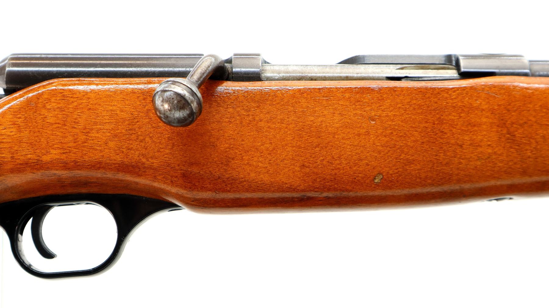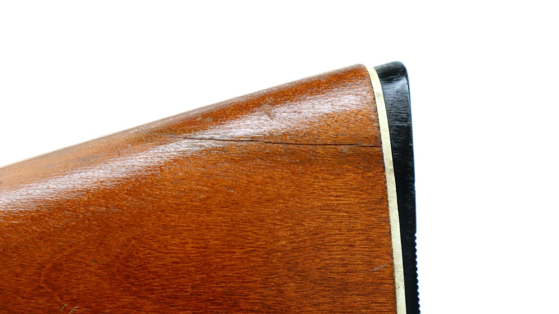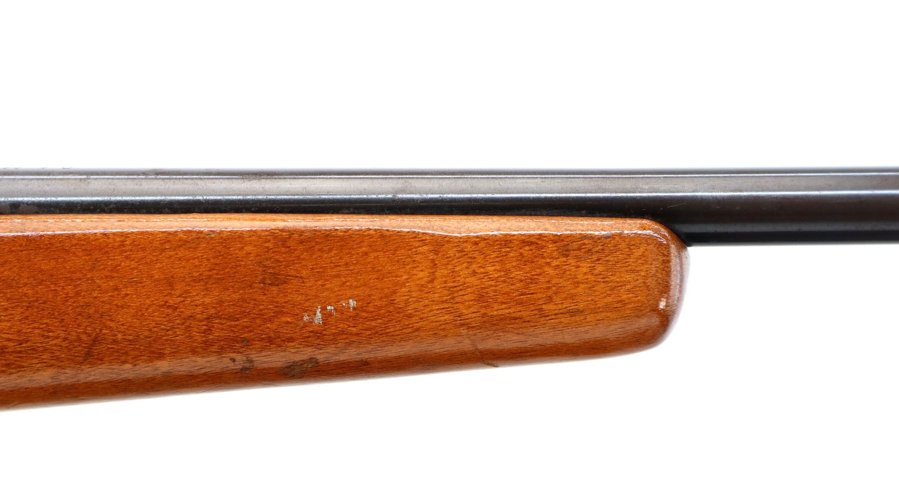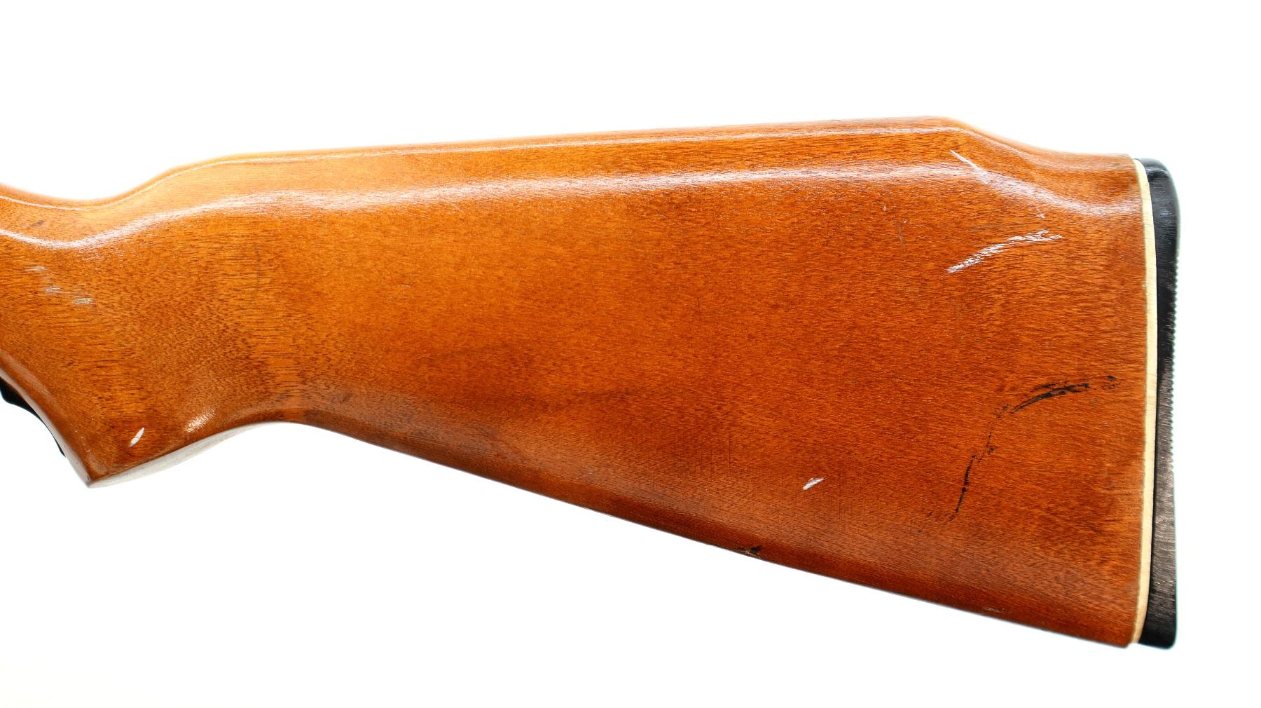 Main Description: Brass bead, round barrel, grooved bolt knob, safety buttons are present. One piece wood stock, pistol grip, grooved black polymer butt plate, stock cracked at toe, 13.75" LOP