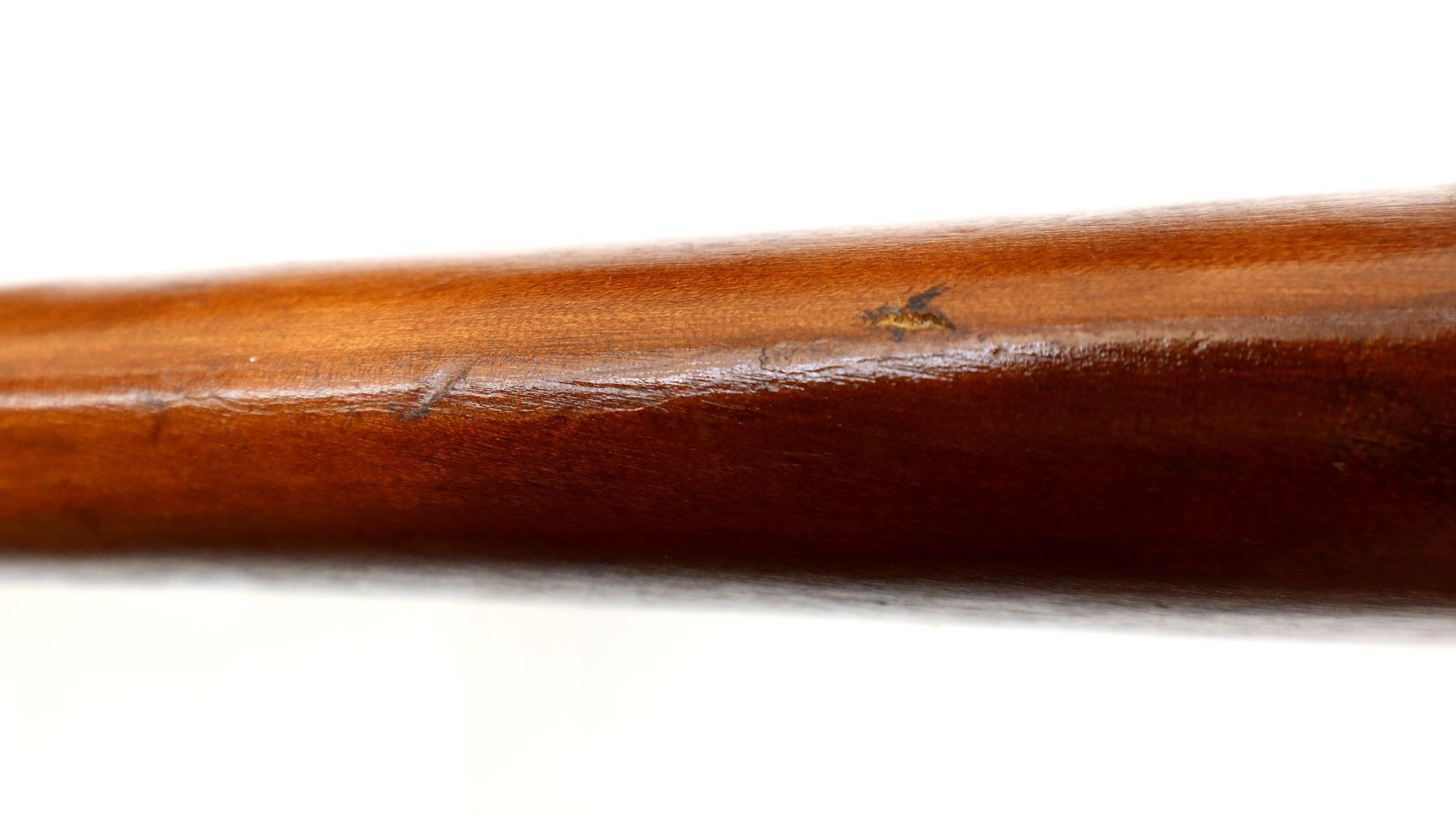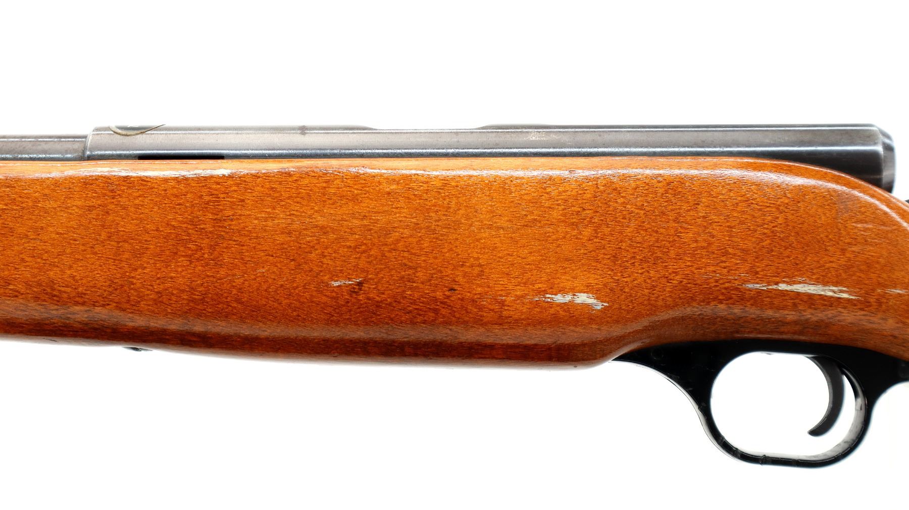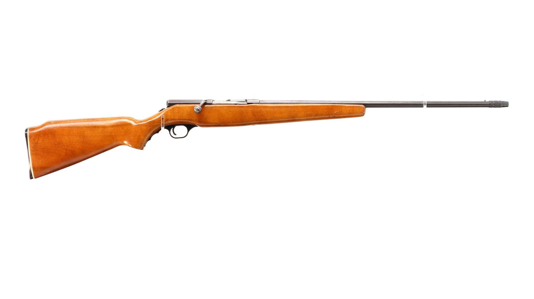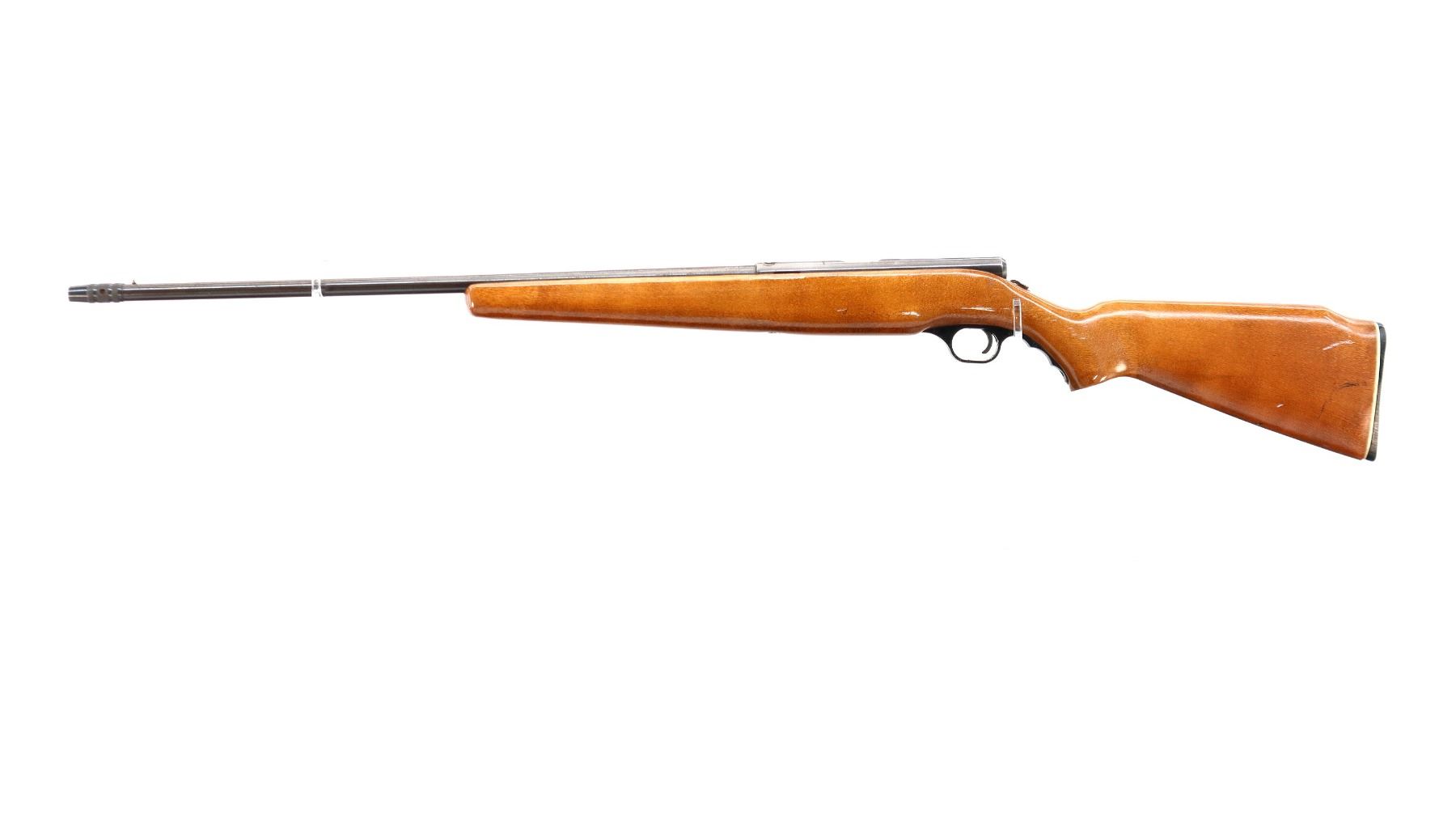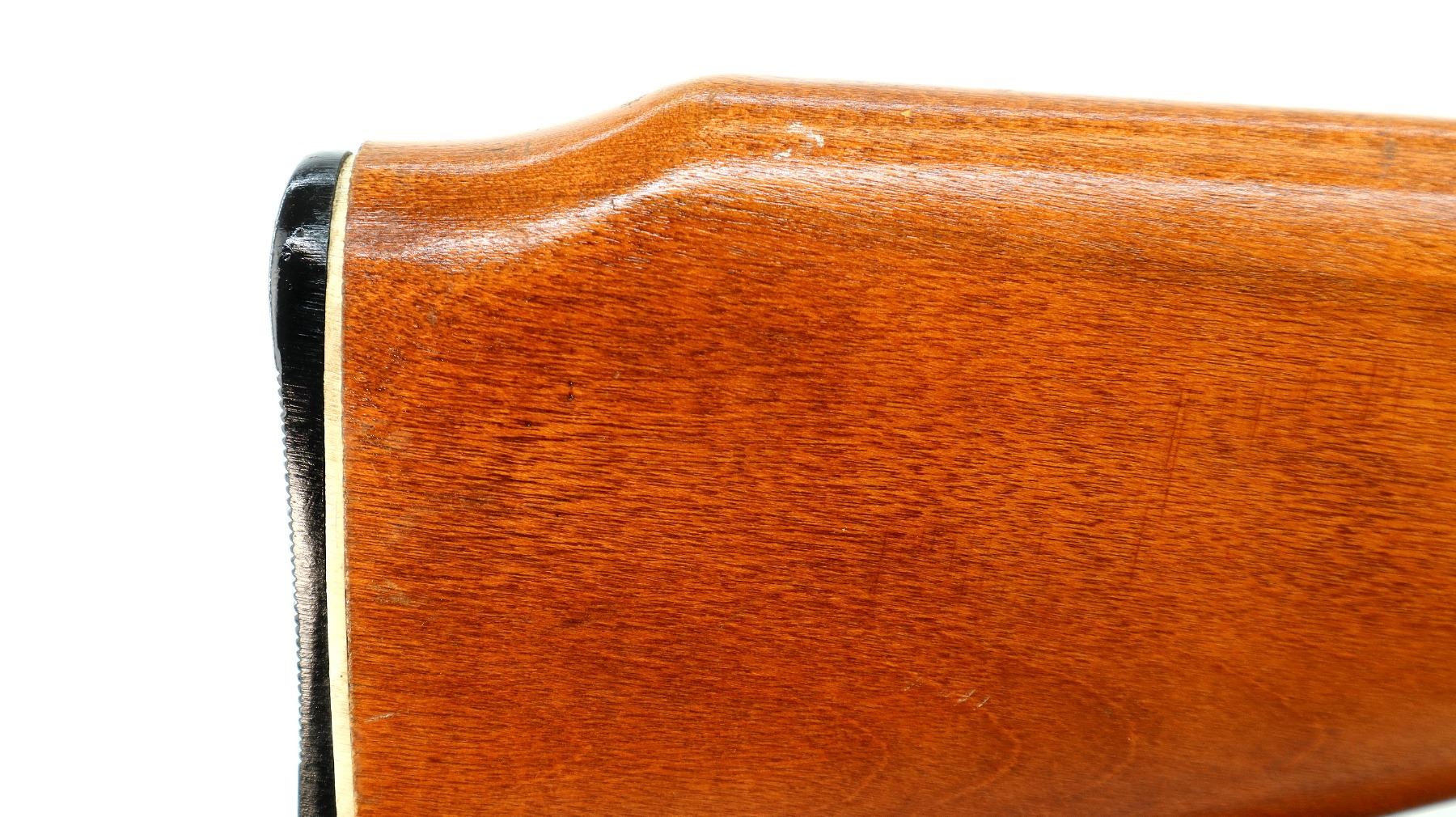 Main Description: Brass bead, round barrel, grooved bolt knob, safety buttons are present. One piece wood stock, pistol grip, grooved black polymer butt plate, stock cracked at toe, 13.75" LOP