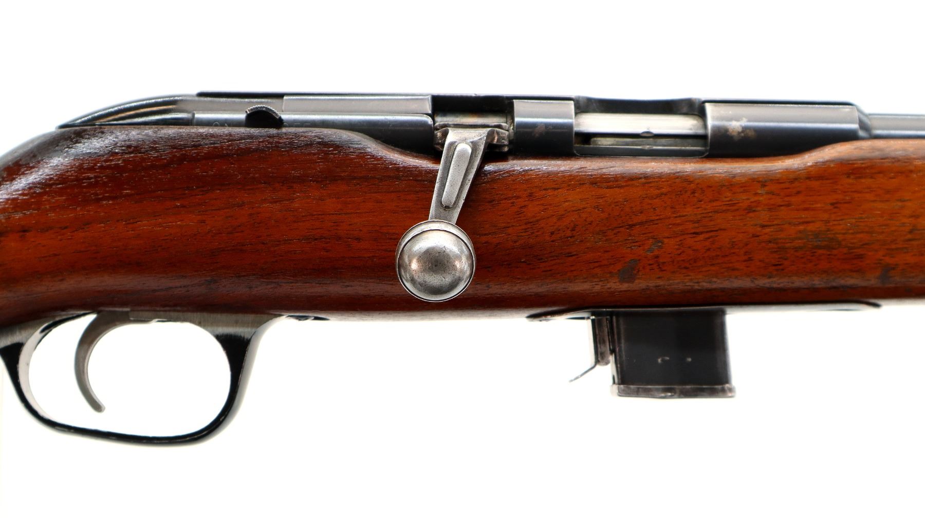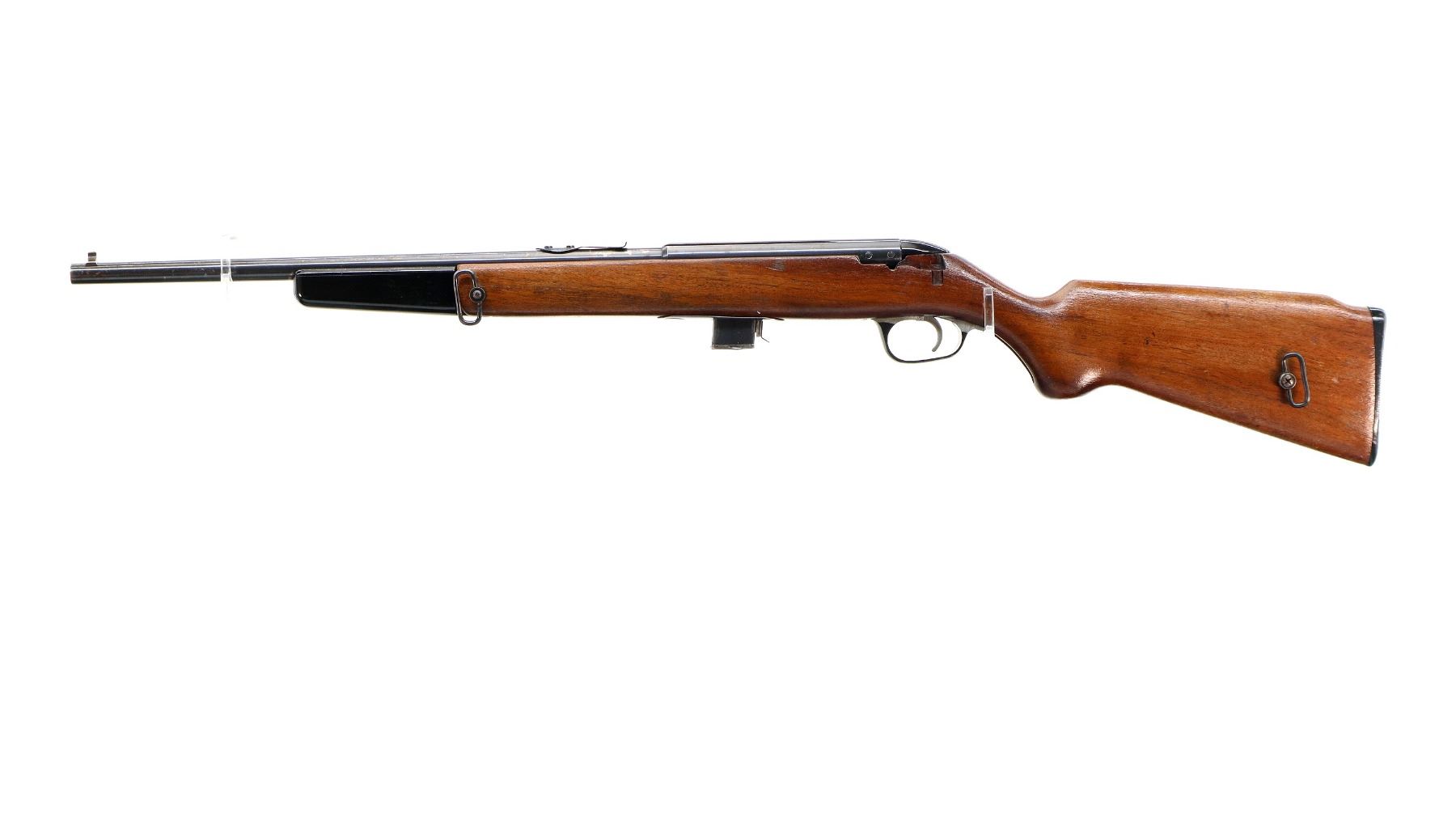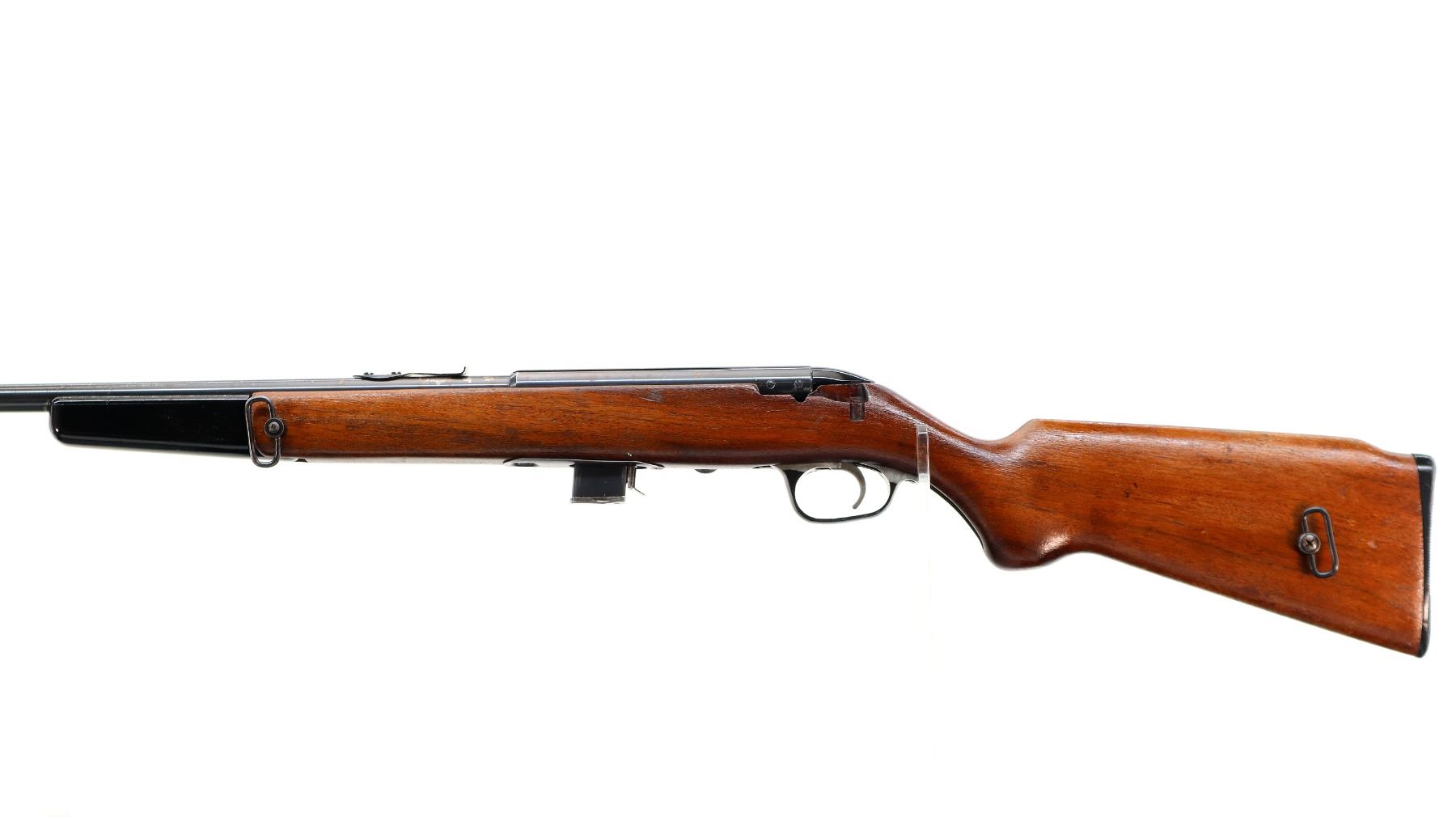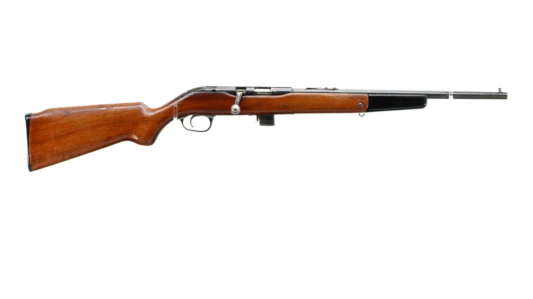 Main Description: Blade front sight, u notched rear sight missing elevator, blued finish, grooved receiver and bolt knob. One piece wood stock, black polymer folding front grip, pistol grip, stock cut out for peep sight on left side, grooved black polymer butt plate, replaced trigger guard and screws, sling swivels.