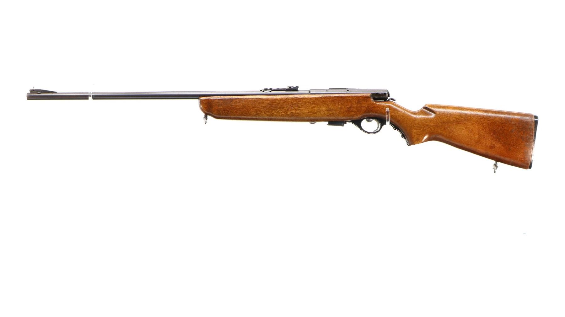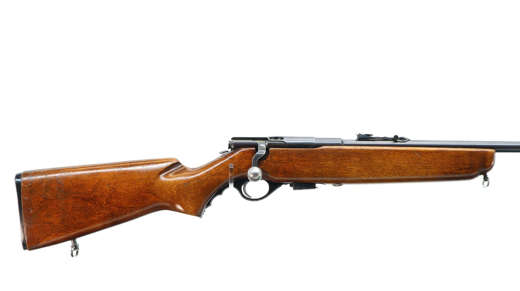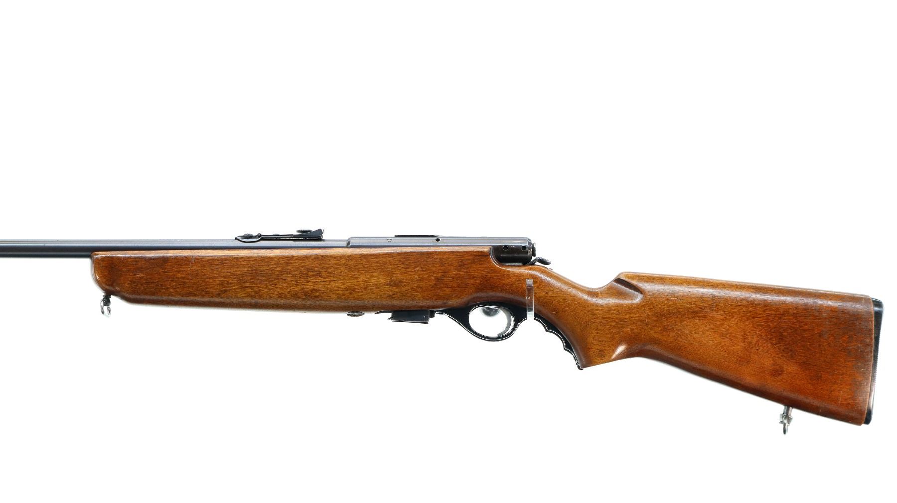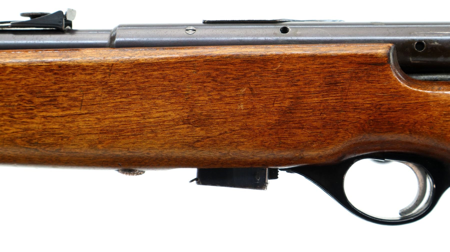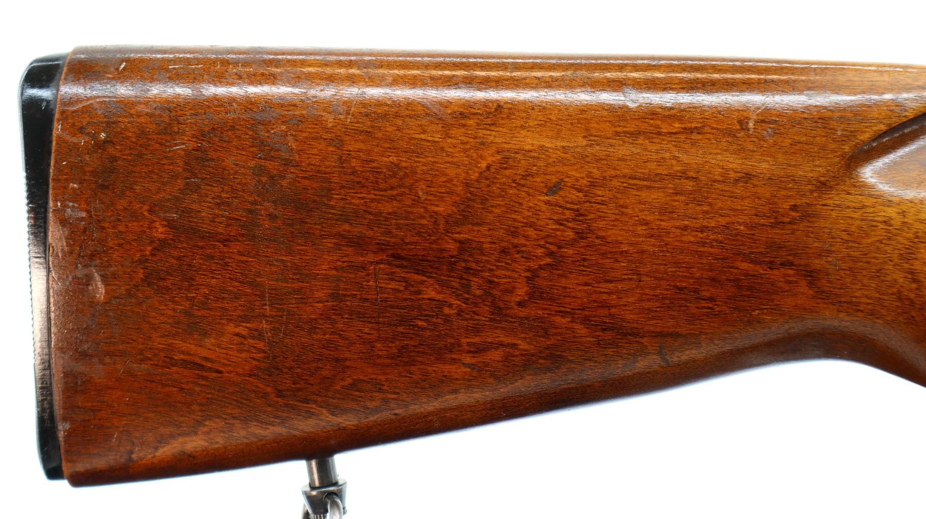 Main Description: Post front sight with ramp, adjustable u notched rear sight, blued finish, receiver drilled and tapped with only one plug screw installed, bolt retains dust cover, smooth knob, safety buttons present. One piece wood stock, pistol grip cracked at wrist, grooved black polymer butt plate, sling swivels.
