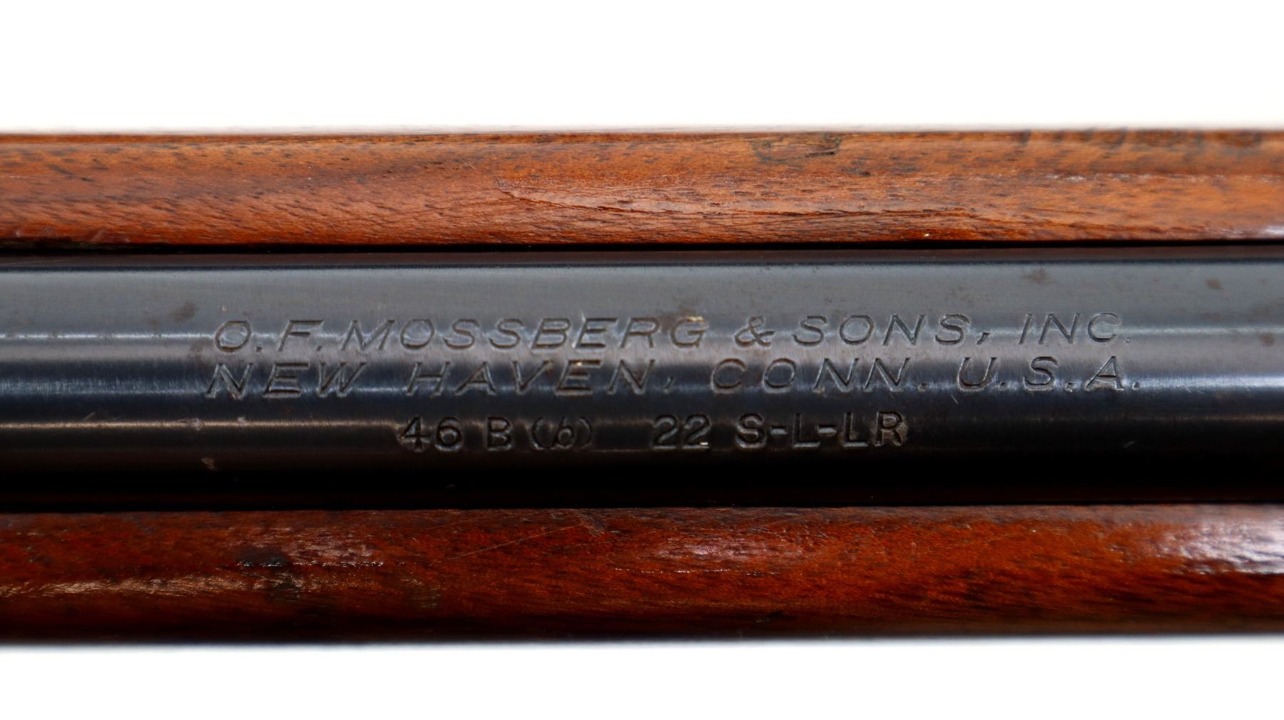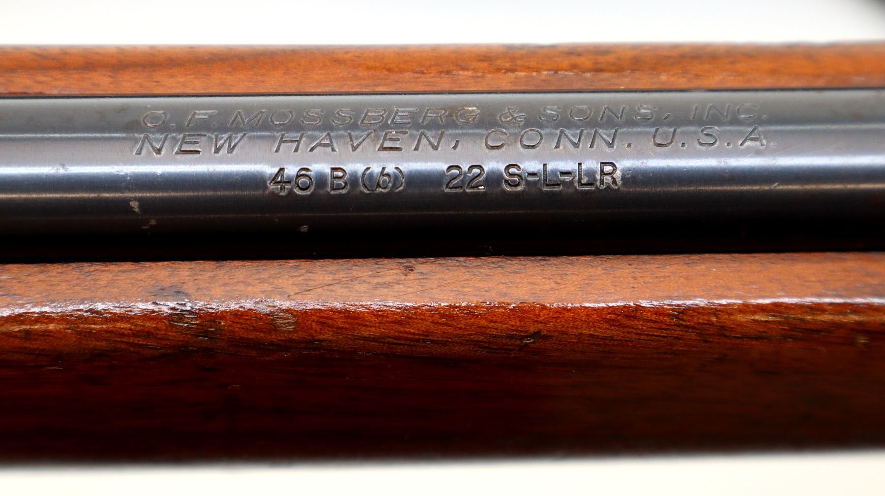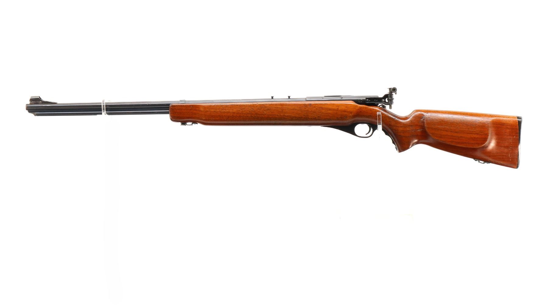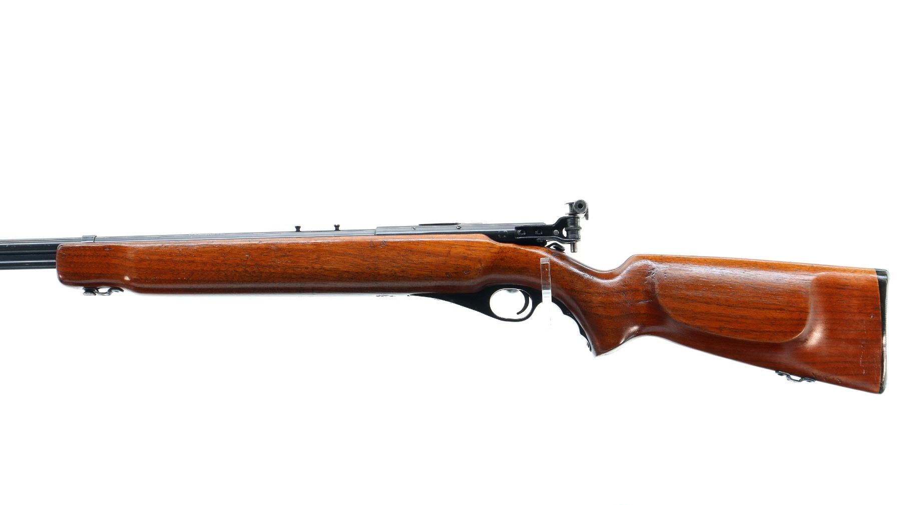 Main Description: Post front sight with hood and ramp, missing rear sight, holes filled with screws, Mossberg S-130 adjustable peep sight on left side of receiver, blued finish, bolt has dust cover and smooth knob, safety buttons present. One piece wood stock, pistol grip, cheek rest, grooved black polymer butt plate, swivel studs.