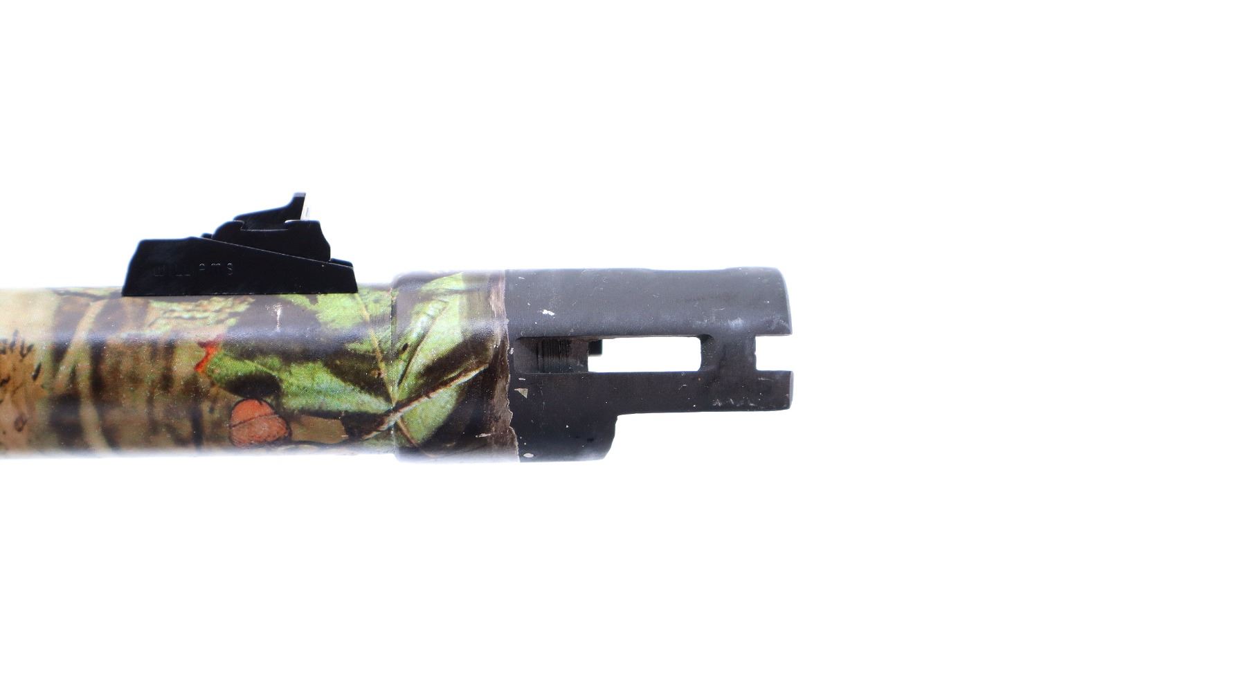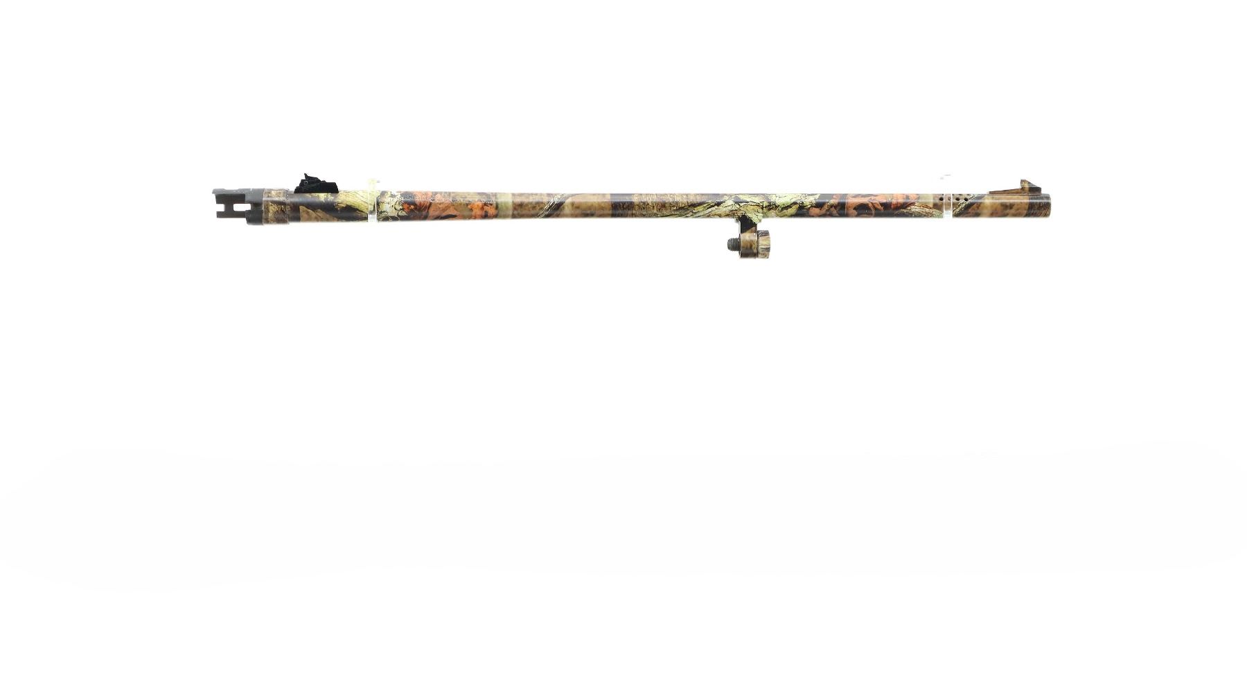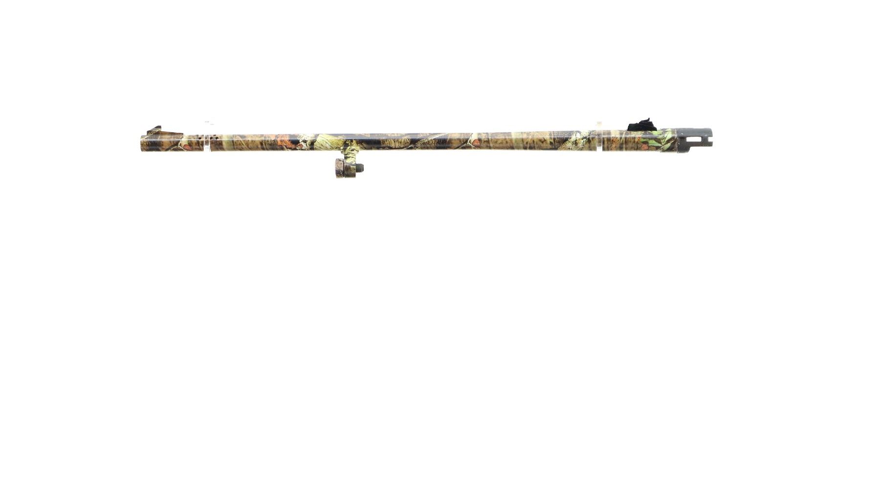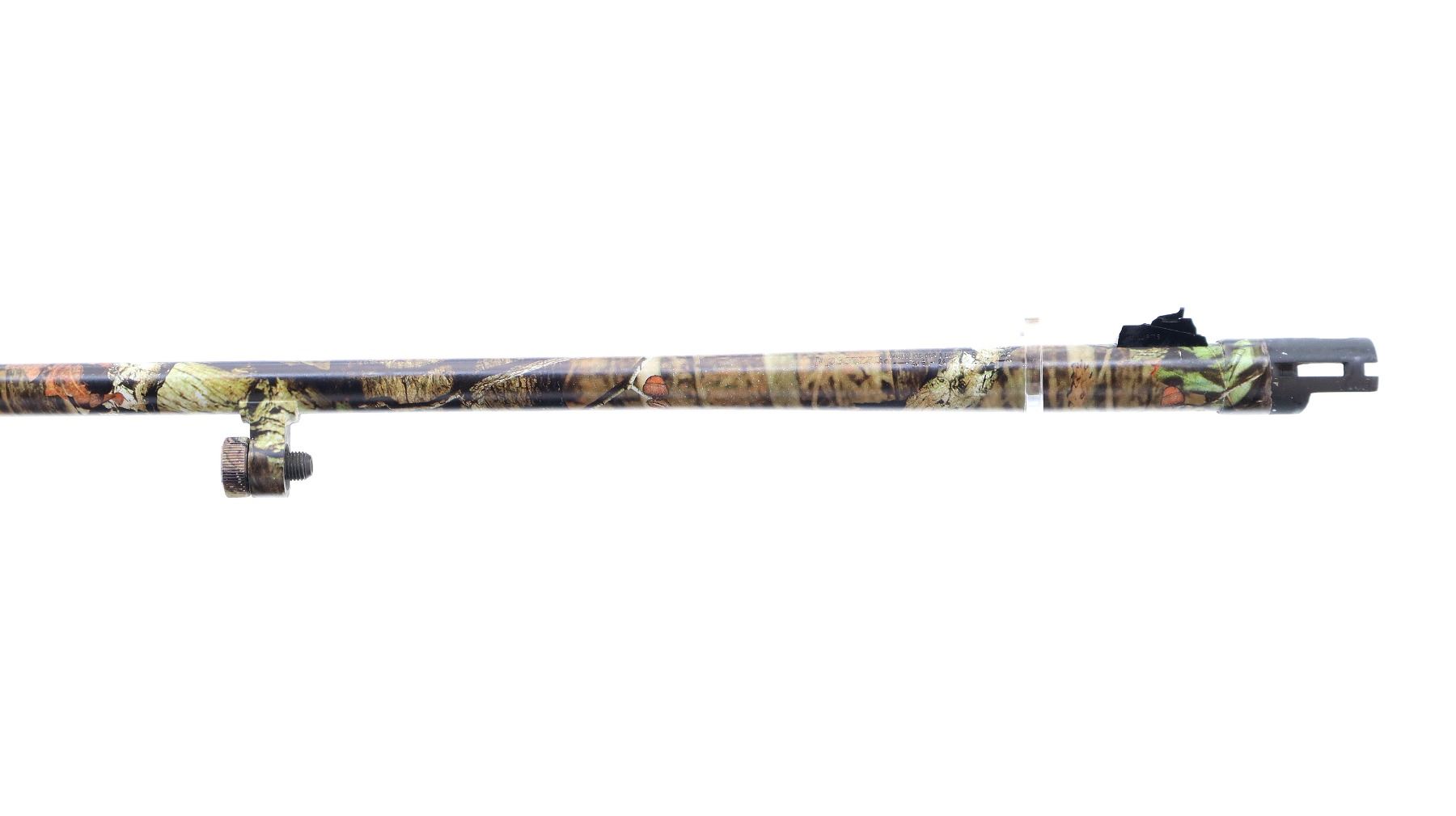 Main Description: White front and brass mid rib beads, Camo finish overall, vent rib, alloy receiver drilled and tapped with plug screws installed, tang safety. Two piece synthetic stocks, checkered forearm and pistol grip, slip on brown vented rubber recoil pad, sling swivels with camo nylon sling. Spare Barrel: 20 G X 3", 24", Very Good, Fully Rifled. Blade front sight with ramp, adjustable u notched rear sight, ported.