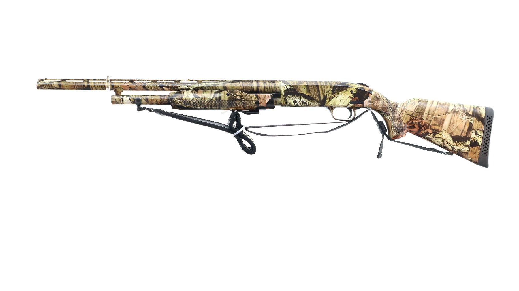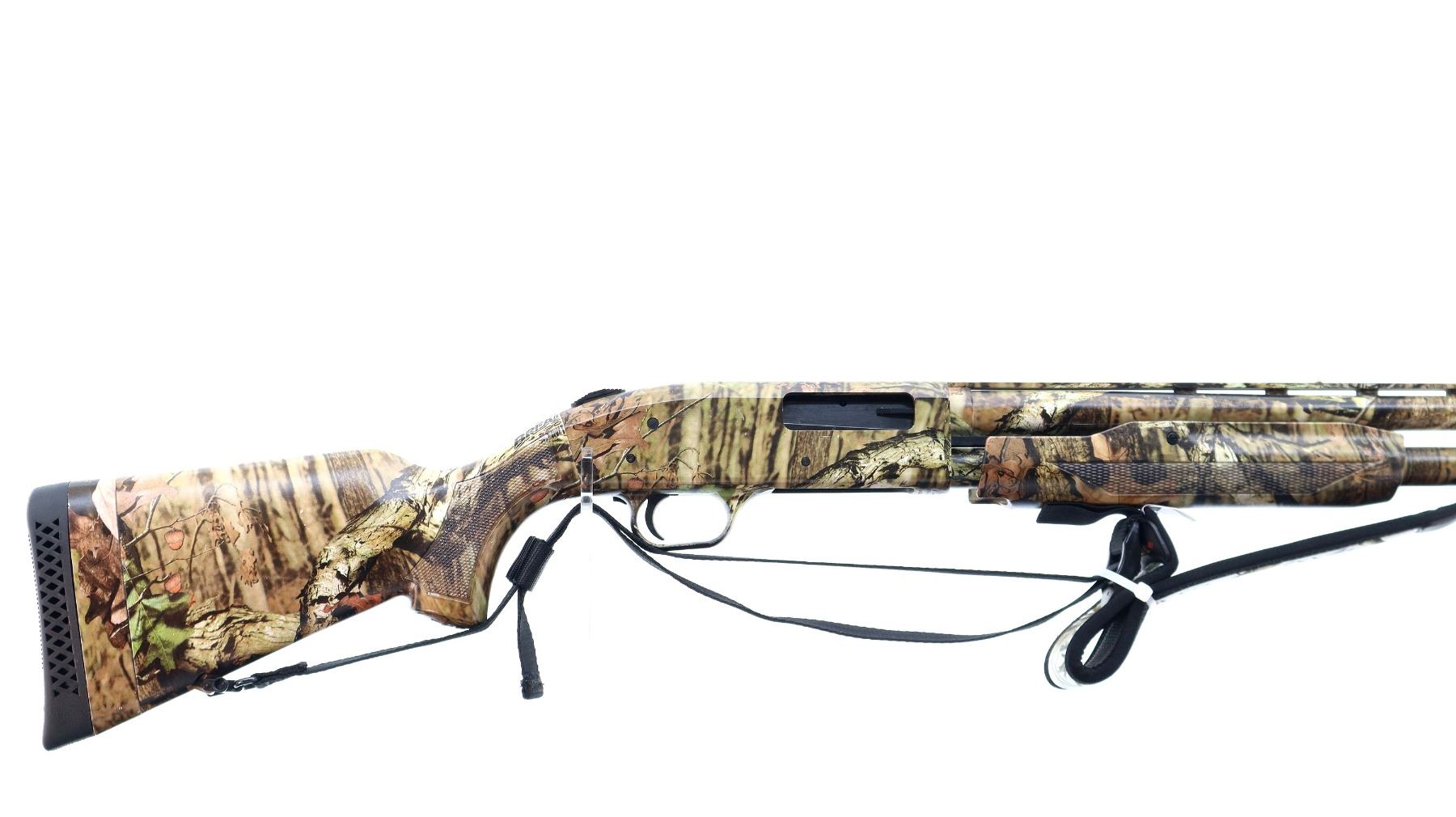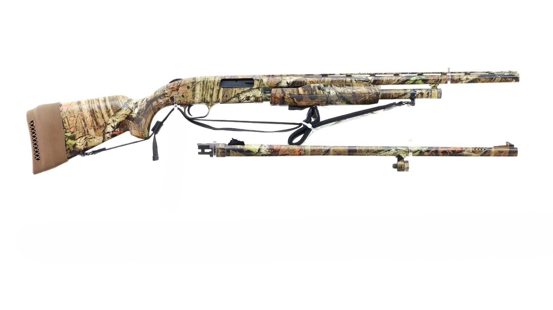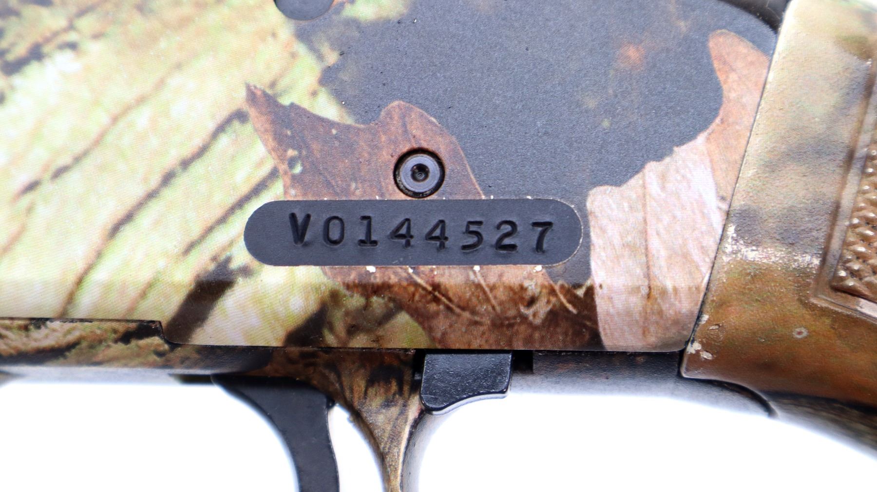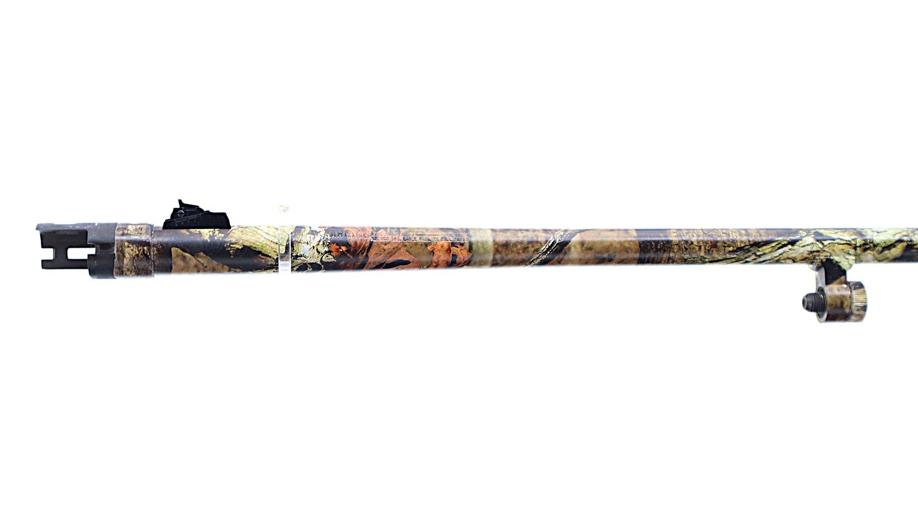 Main Description: White front and brass mid rib beads, Camo finish overall, vent rib, alloy receiver drilled and tapped with plug screws installed, tang safety. Two piece synthetic stocks, checkered forearm and pistol grip, slip on brown vented rubber recoil pad, sling swivels with camo nylon sling. Spare Barrel: 20 G X 3", 24", Very Good, Fully Rifled. Blade front sight with ramp, adjustable u notched rear sight, ported.