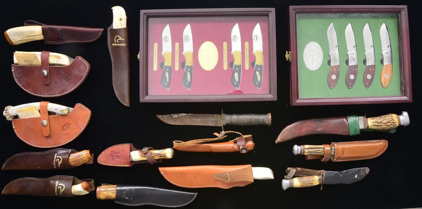 CONDITION: all very good or better unless noted. Near excellent cased set of 4 Ducks Unlimited fixed blade skinners by Stone River marked for 4 major flyways / near excellent case set of 4 Ducks Unlimited folding skinners honoring Ducks of North American Flyway / 4 – 4" bladed skinners by Mattson D having antler based handles in Ducks Unlimited marked sheathes / 5" blade w/ Mattson carved antler handle / 3.5" blade Mattson w/ antler handle & Schrade sheath / 2 Mattson w/ 2 1/4" blades & antler handles / curved blade Mattson additionally marked Fort Heiden w/ carved curved antler handle / T handled Mattson skinner w/ Alaska & bear paws on blade plus bear carved bone handle / Mattson bone T handled skinner / DMKU of Homer Alaska w/ bear carved antler handle & sheath / 2 Same but larger w/ plain antler handle / The Bone Collector 3" blade antler handled skinner w/ sheath; made in Pakistan / Northern Knives 3" bladed skinner w/ plastic handle & sheath; made in China / DMKU 6" fillet knife w/ bone handle / fair unmarked vintage stag handled hunting knife w/ 5" blade & sheath / poor vintage stag handled hunting knife w/ 4.5" blade / poor Camillus U.S. fighting knife w/ 6.5" blade / very good Erik Anton Burg Rostfri Swedish knife w/ 4" blade, wood handle & sheath / fair curved 8" blade hunting knife w/ antler handle & sheath; marked Loffe Soligen, Germany. (02-13864/NW). $600-900.
