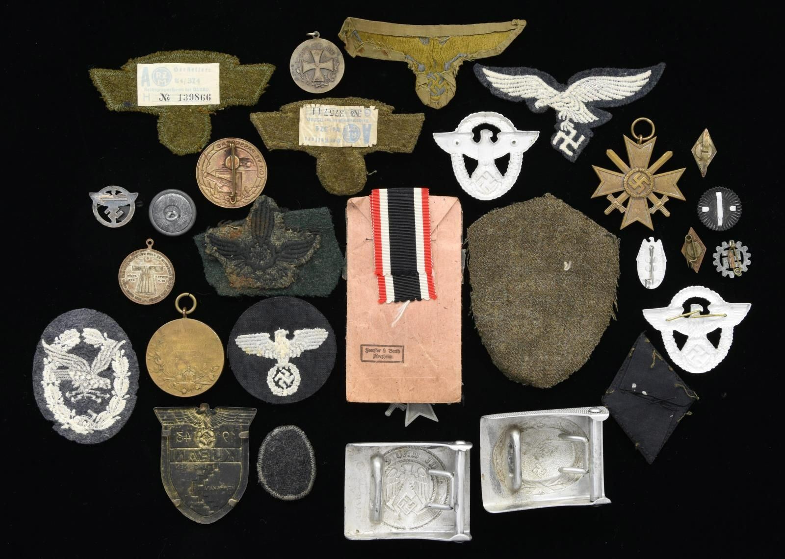 MORE. This varied lot includes 1 aluminum Luftwaffe belt buckle. / 1 Aluminum HJ belt buckle. / 2 NSKK flat bullion breast eagles with RZM tags on the reverse. / 1 Army Afrika Corps blue & tan breast eagle. / 1 Luftwaffe enlisted breast eagle. / 1 War Merit Cross with swords & original ribbon taped to its issue envelope. / 1 Kuban shield with no backplate. / 1 War Merit Cross with swords but no ribbon. / 2 Aluminum police visor cap eagles, one without pins. / 1 NSFK membership pin missing its pin on the reverse. / 1 Political leader’s uniform button. / 1 DAF membership pin. / 1 Kaiser Wilhelm Medal of 1897, with no ribbon. / 1 Cloth Red Cross overseas cap eagle. / 1 Cloth police sleeve eagle. / 1 Italian cloth tri-wing insignia. / 1 Cloth Luftwaffe Air Gunner’s Badge. / 1 HJ 1938 tinny. / 2 HJ enamel membership pins. / 2 Imperial German Commemorative Medals with no ribbons. / 1 Cockade to be used with a visor cap wreath. / 1 Second pattern NSKK cloth Qualified Driver’s sleeve badge. / 1 RAD female section cloth sleeve badge with wheat ears & party symbol over “XXIX”. / 1 Possibly French “ON NE PASSE PAS” badge. CONDITION: all items show light wear and are complete, except as noted. (02-21842/BF). $500-700.