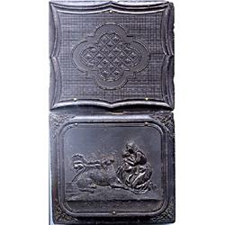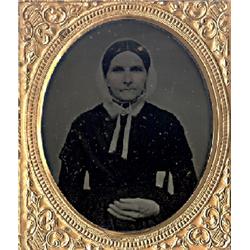 1/6 plate ambrotype of woman. No pad inside the cover. Cover has two spots of wear along edges. Geometric back also has some wear, repair at bottom right.