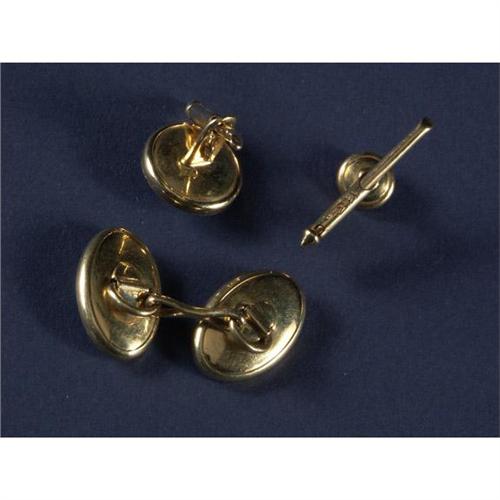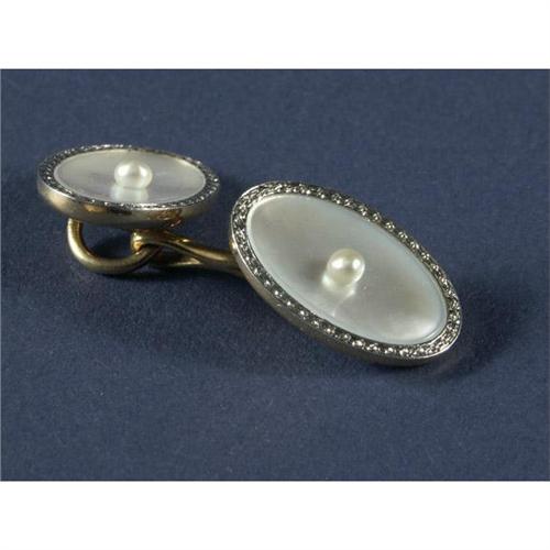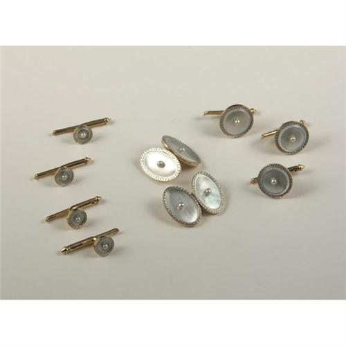 MAN'S JEWELRY: Classic 14k yellow gold, mother-of-pearl cufflinks and button studs accented with cultured pearls. The lot includes one pair of cufflinks, three vest button studs and four shirt studs. No appraisal is included with this lot.