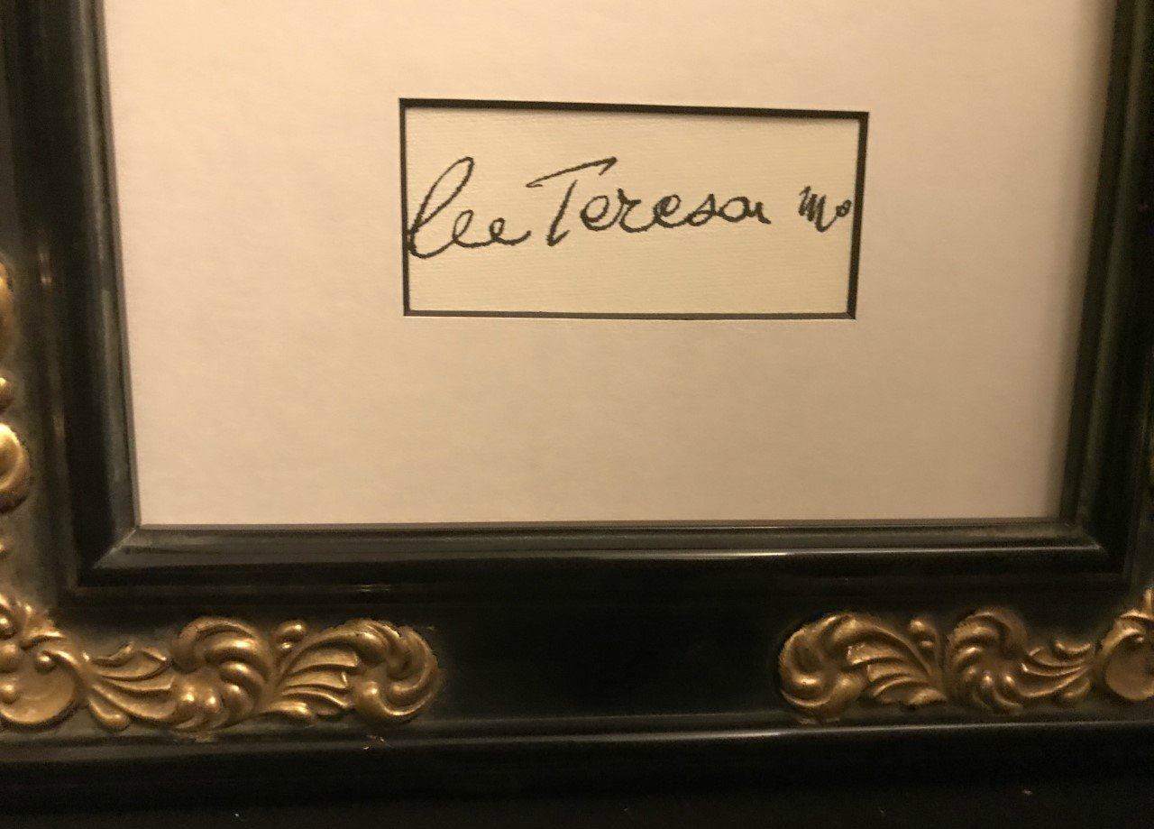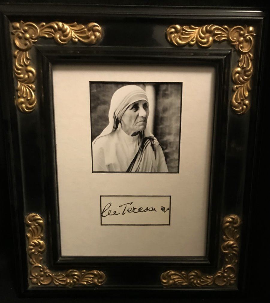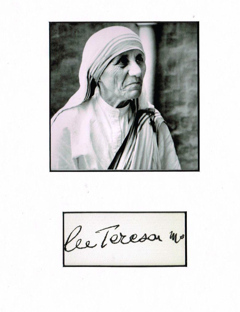 Mother Teresa, known in the Catholic Church as Saint Teresa of Calcutta, was an Albanian-Indian Roman Catholic nun and missionary. She was born in Skopje, then part of the Kosovo Vilayet of the Ottoman Empire. A rare autograph professionally mounted, framed in a wooden and antique style moulded frame. Supplied with coa.