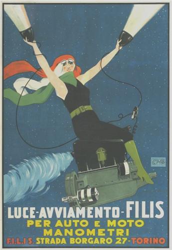 BISCANTI. LUCE AVVIAMENTO FILIS PER AUTO E MOTO, TORINO. 1922. 96x66cm. (38x26in.). Litografía. B+. Entelado.