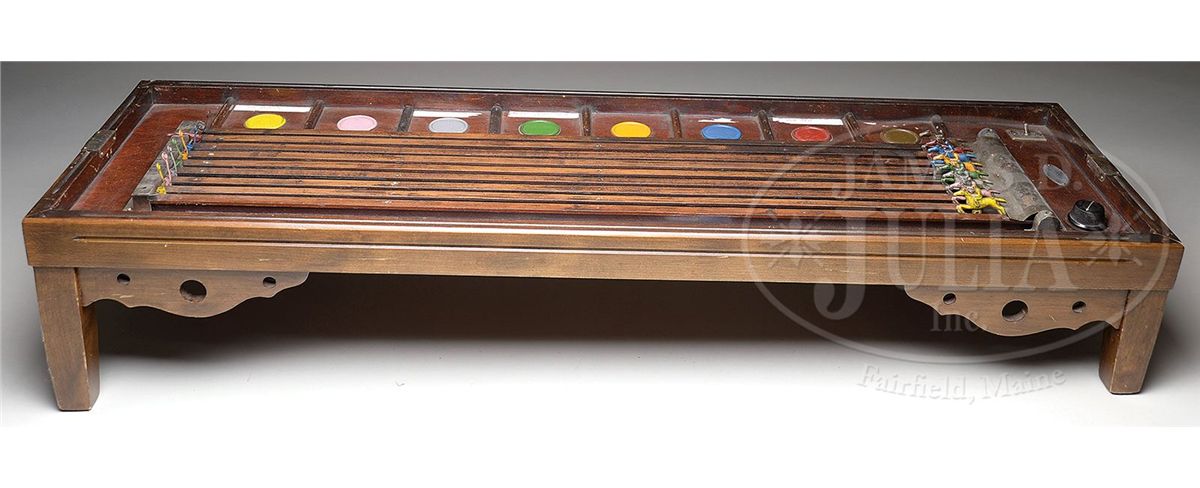 Wooden electric tabletop gambling game with eight lanes set with different color lithographed tin horses and jockeys. Side of game has colored discs corresponding with each nag so players can place their bets on their favored choice. Flick the switch and the race is on. The vibration caused by the General Electric motor moves the horses to their respective finish lines. SIZE: 43" l x 13" w x 8-1/2" h. CONDITION: Overall good to very good. Motor is functional but horses do not advance. An earlier owner has placed stickers on the surface remnants and residue remains. 1-13397