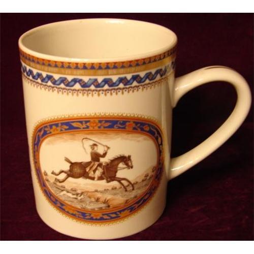 20TH. Century Mottahedeh Limited Series No. 044/150 Fox Hunting Scene Mug/Tankard. This wonderful reproduction of a Chinese Export Fox Hunting 18th century Mug was made by Mottahedeh and was made at their factory in Portugal. Marked VA Vista Alegre is a Limited Series ind is #044/150. It is in Excellent Condition. No chips, cracks or Restoration. It measures 6" in height and the diameter of the opening is 4 3/4". Beautiful Fox Hunting Scene of a Rider on a Horse with Dogs approaching a Fence ready to go on the Hunt. Beautiful Blue and Gold Decoration. Mottahedeh is Very Collectible and is getting harder and harder to find. As dealers in 18th and 19th Century Chinese Export Porcelain we have expanded our inventory in Mottahedeh Porcelain which is Very Decorative and Collectible and keeps growing in Value as each year passes. It is also getting harder to find nice undamaged unusual and interesting pieces.