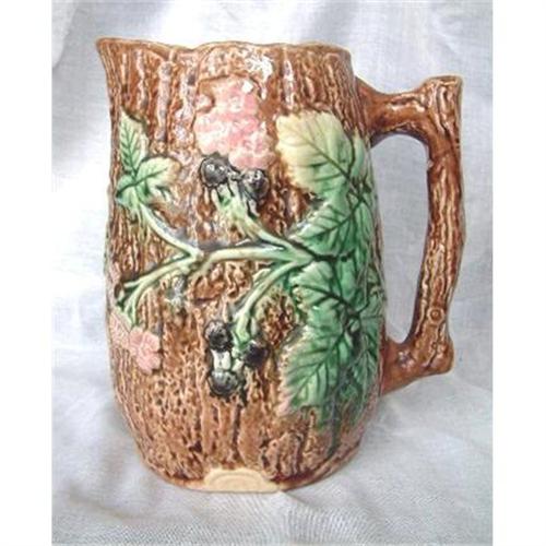 Large jug with moulded decoration of blackberries on a rustic trunk background and finished with a majolica glaze , dating from around 1880. Light crazing over the surface and a long hair crack which goes around the base , for about 2/3 of the circumference , very stable . SIZE 7.5 ins high x approx 4.75 at widest diameter .