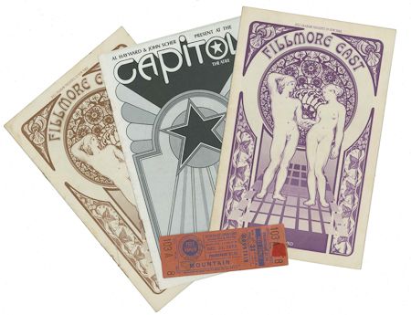 1970-73. After the breakup of West, Bruce & Laing, the re-formed Mountain (West, Pappalardi, Allan Schwatzberg on drums and Robert Mann on keyboards) played their inaugural gig: a 1973 New Year's Eve show at Madison Square Garden. An additional early show was added when the 11 PM gig sold-out! This unused guest ticket from the later show is pictured in Leslie and Corky's "Nantucket Sleighride and other Mountain On-The-Road Stories". EX., with tape on right border. Also included are Fillmore East programs from May 1970 & New Year's Eve week 1970 and a program from the Capitol Theatre, Passaic, NJ, New Year's Eve 1971. VG/EX. From Corky Laing's personal collection.