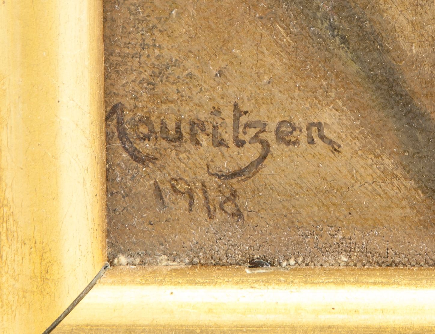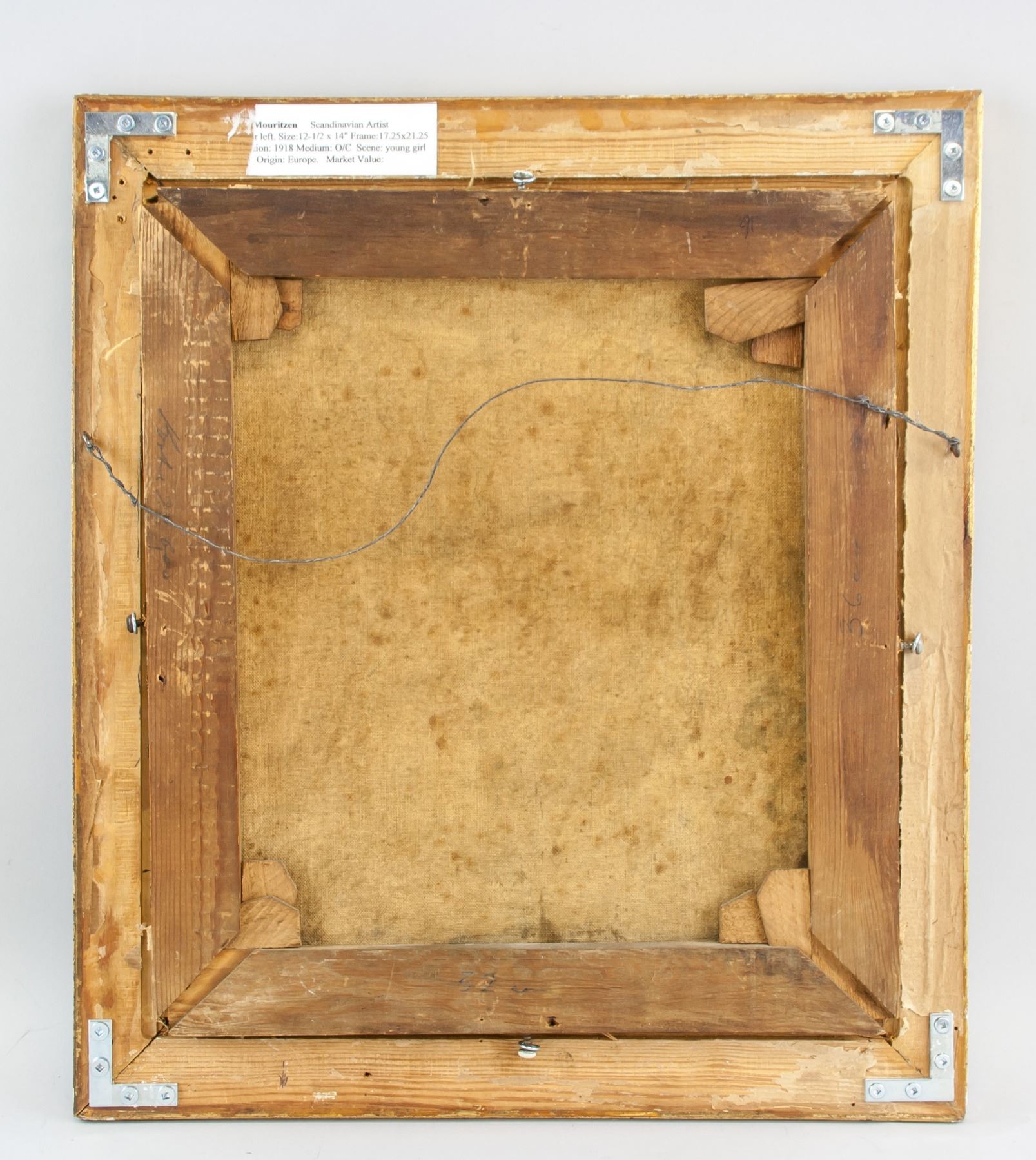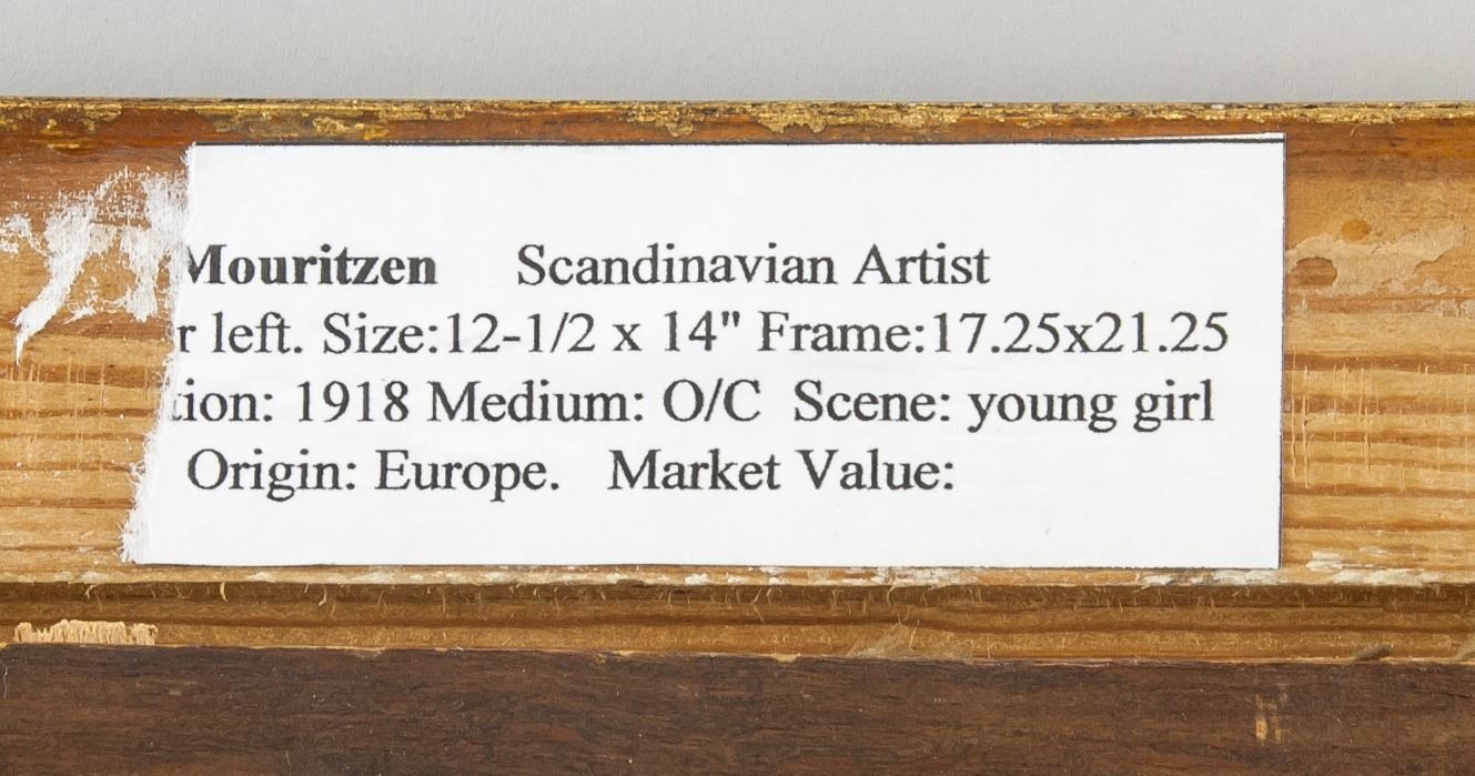 Oil on canvas. Featuring young girl. Signed Mouritzen. Scandinavian, 20th century. Dated 1918. 14.2 x 11.8 in. (36 x 30 cm)
