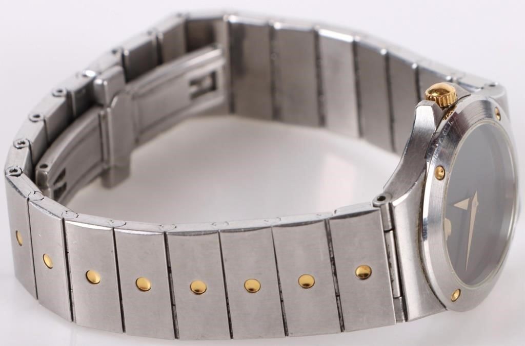 Watch features sapphire crystal, stainless steel case, strap, and clasp. No numerals on dial.