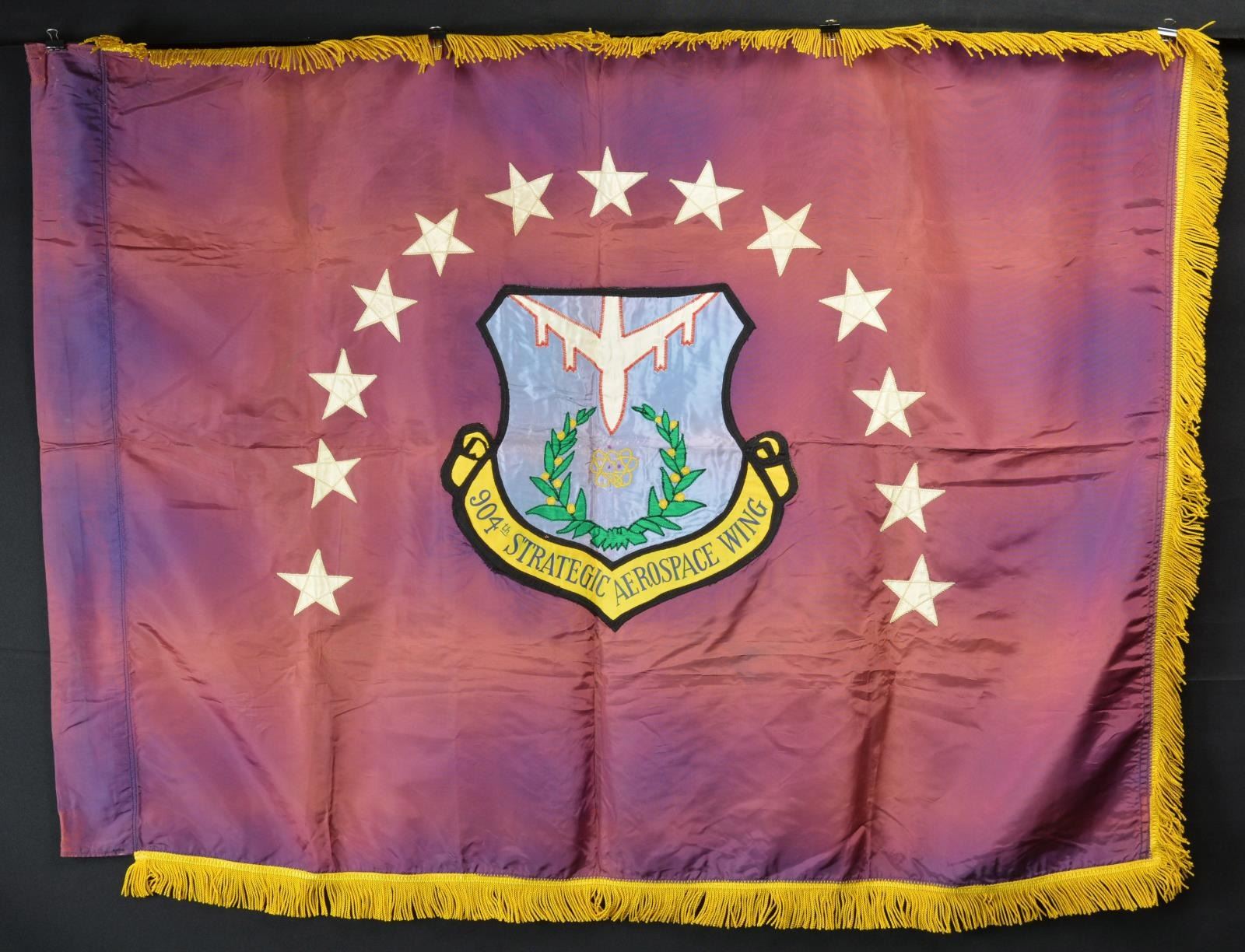 AEROSPACE WING FROM 1963 THRILLER "GATHERING OF EAGLES". This Cold War nuclear war classic starred Rock Hudson & Rod Taylor. This fantasy flag is shown in President John F. Kennedy's office in film. Made like regulation 3x4' American military unit flag, double applique 13 stars above logo. CONDITION: good very good overall with light fading. (02-18038-9/JS). $200-300.