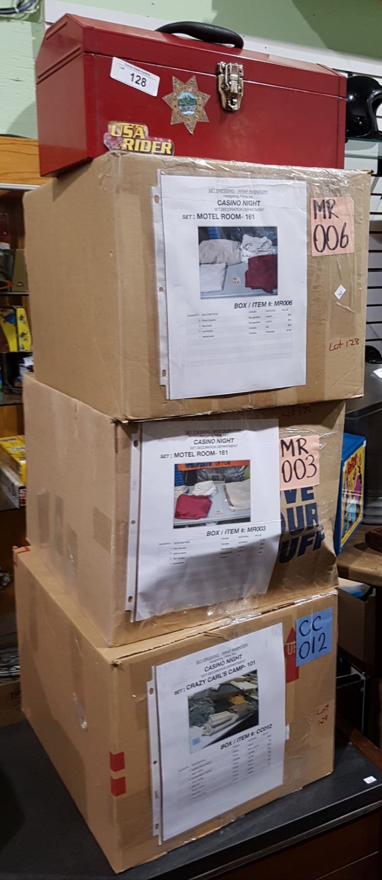 MOVIE PROP LOT - RED TOOL BOX & 3 LARGE UNOPENED BOXES