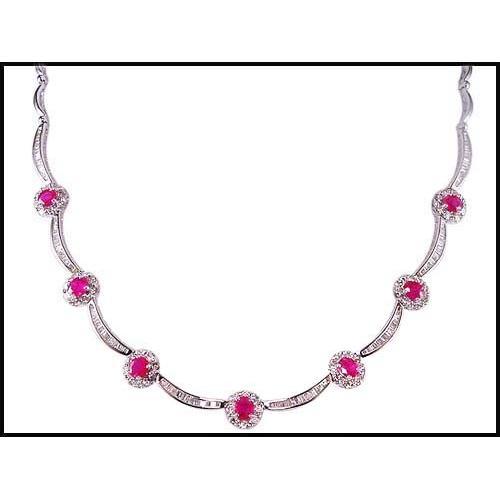 This 18K white gold ruby and diamond necklace is perfect for a movie queen on the red carpet. 7 very fine color, sparkling rubies and 188 diamonds have combined weight of almost 7 carats. The word that comes to mind to describe this stunning necklace is "WOW!!". It measures 16 1/2" around the neck (195MM). The reasonable $7,500.00 price tag is thrown away, so you may own it now for just a fraction of that.<p>Note: Free shipping for this item, we cover for you.