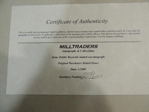 MOVIE STAR PHOTO & AUTOGRAPH DEBBIE REYNOLDS COA. INLCUDES COA FROM MILLTRADERS AUOTGRAPHS & COLLECTIBLES. AS SHOWN. VIEW PICTURE FOR DETAIL. PLEASE BE ADVISED, AND INFORMED REGARDING SIGNATURES OR AUTOGRAPHS THAT WE SELL AT AUCTION: WE ARE NOT AUTHENTICATORS, AND WE DO NOT AUTHENTICATE, OR VALIDATE ANY AUTOGRAPHS OR SIGNATURES THAT WE OFFER AT AUCTION. SOME AUTOGRAPHS OR SIGNATURES MAY COME WITH AN AUTHENTICATION FROM ANY ONE OF LITERALLY HUNDREDS OF AUTHENTICATORS ACROSS THE COUNTRY, AND AROUND THE WORLD. WE DO NOT ENDORSE ANY AUTHENTICATOR, NOR DO WE GUARANTEE THAT ANY AUTOGRAPH OR SIGNATURE IS AUTHENTIC, OR THAT IT WILL PASS AUTHENTICATION BY ANY AUTHENTICATOR. ALL AUTOGRAPHS OR SIGNATURES ARE SOLD