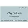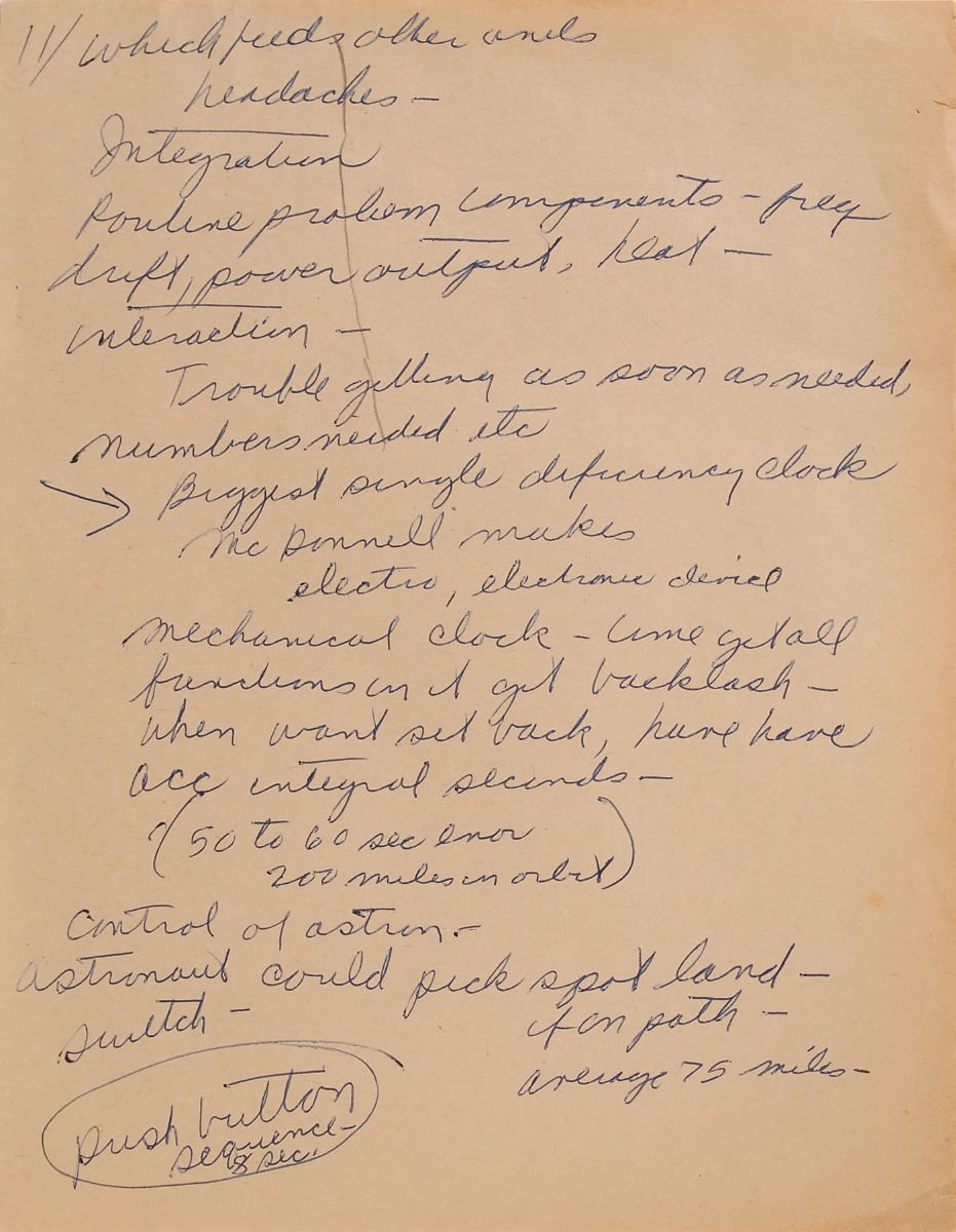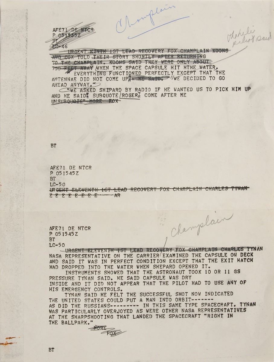 Two pages of space journalist Mary E. Bubb’s handwritten notes, one page in ballpoint and one in pencil, 8.5 x 11, from the MR-3 launch on May 5, 1961. Some notes from the first page, in part: “Integration, Routine problem components…power output, heat…Trouble getting as soon as needed…Biggest single deficiency clock, McDonnell makes, electric, electronic device, mechanical clock…astronaut could pick spot land—switch…average 75 miles…push button sequence—8 sec.” Her second page of live, on-the-scene notes, in part: “Capsule to internal power T-13, T-10+40 sec., T-7 hubbub, 2 min 40 sec holding…80 sec chaos…Freedom 7.” Also includes an original wire-teletype page from the USS Lake Champlain, Shepard’s recovery ship in the Atlantic. In very good to fine condition. Accompanied by one of Bubb’s business cards from the 1990s and a biographical sheet. From the collection of aerospace memorabilia specialist Ken Havekotte.