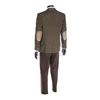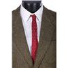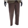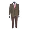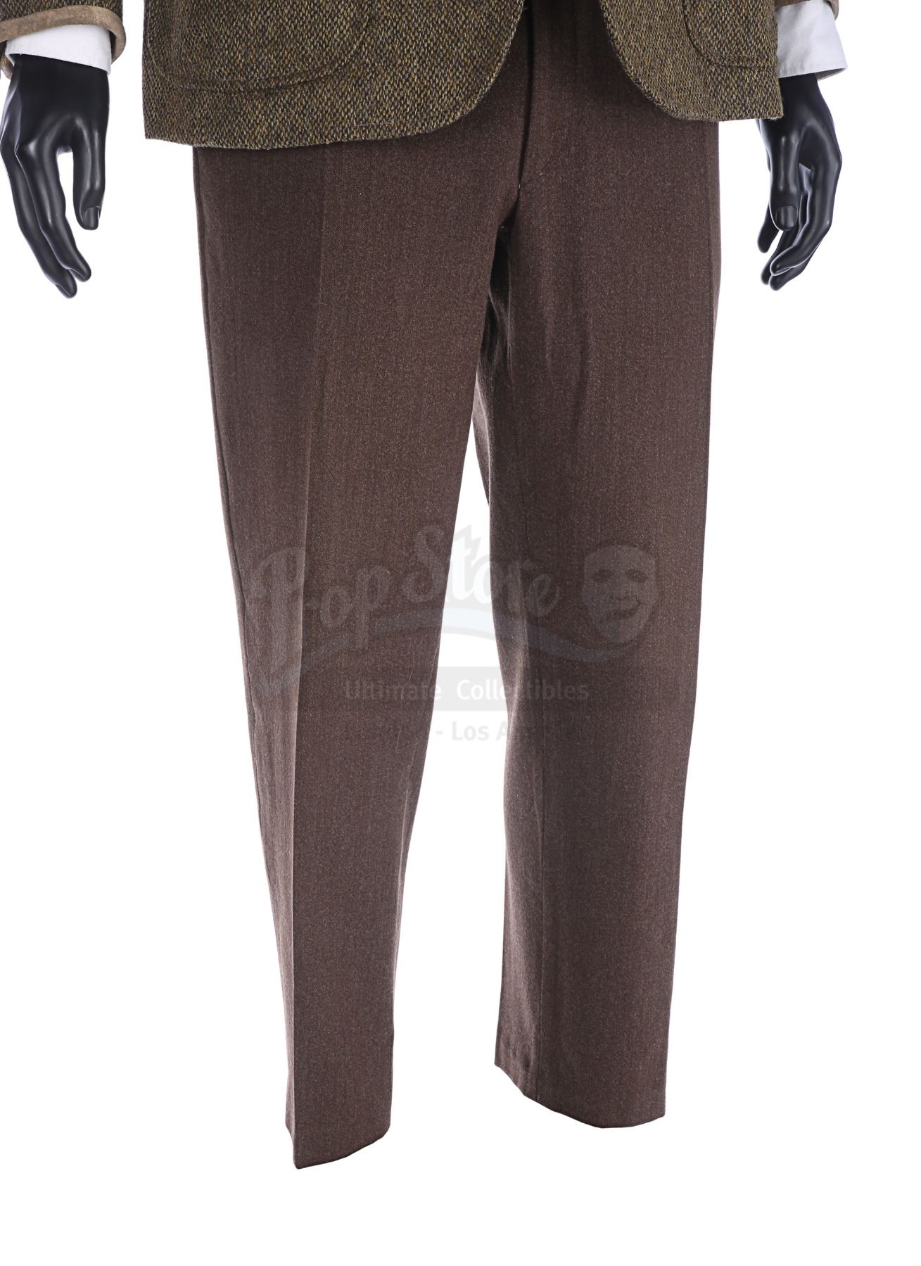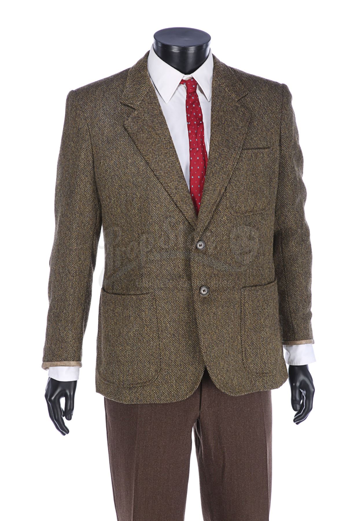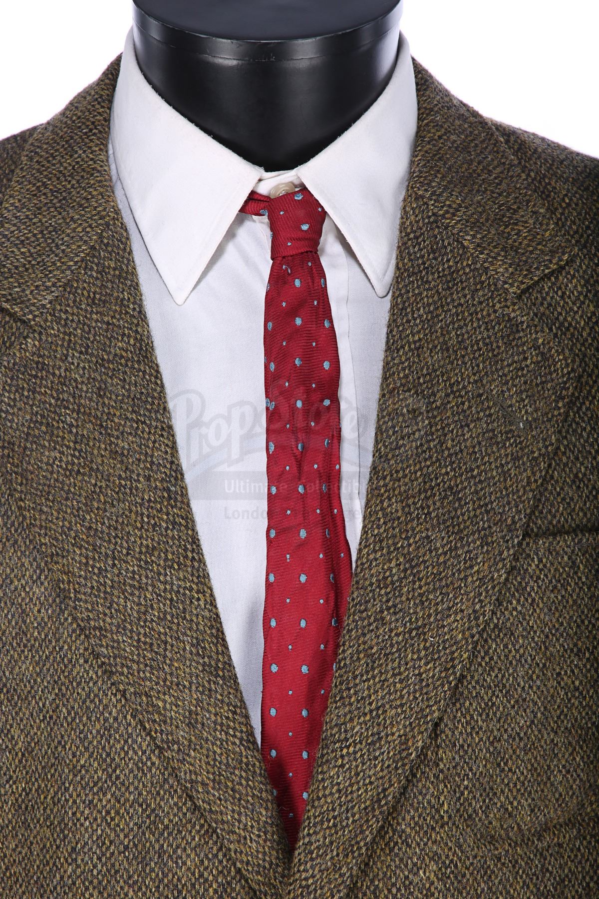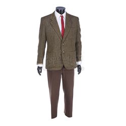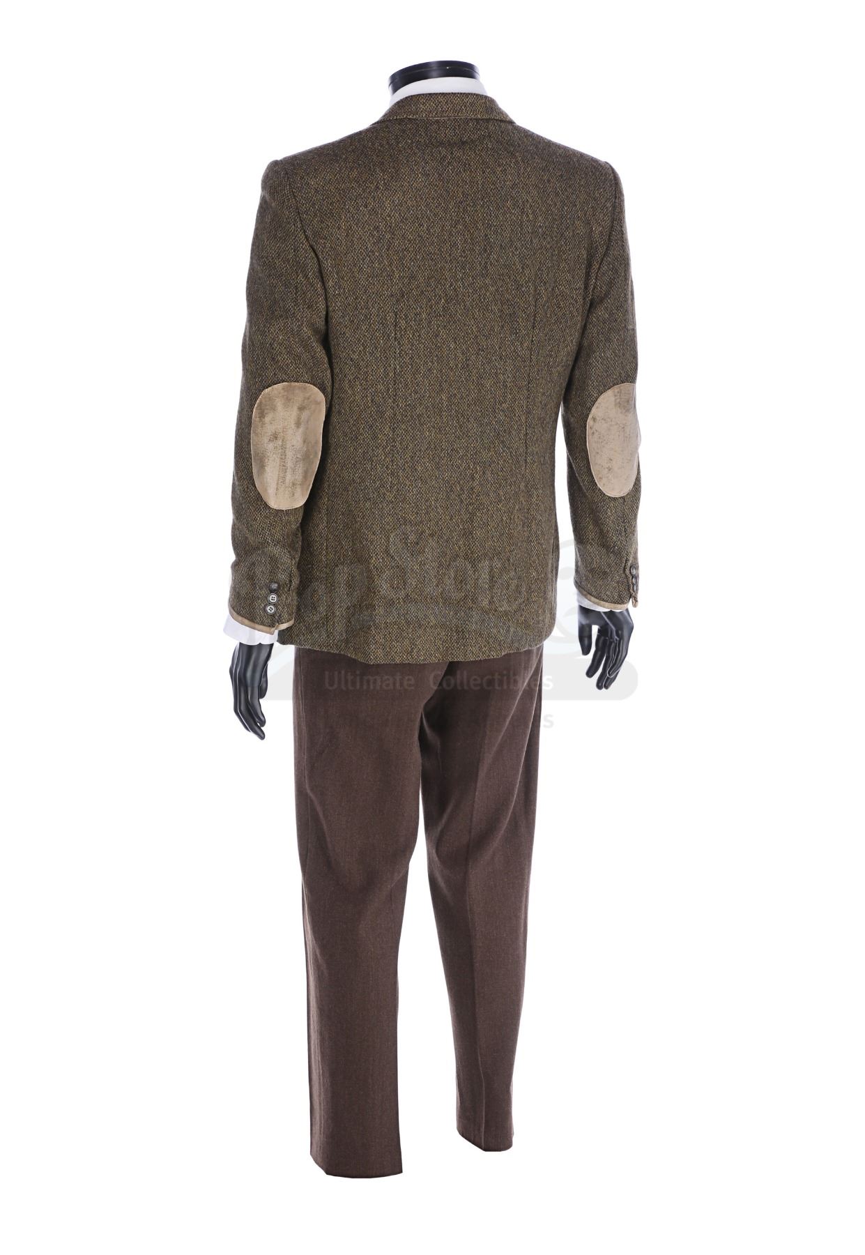 The costume comprises a brown tweed jacket featuring beige leather elbow patches; a white cotton shirt; a red tie decorated with a blue embroidered dot pattern; and a pair of brown woollen trousers. The label in the shirt displays a faded "B" written in black marker. Signs of production use include light plucking on the tie's pattern and minor stains on the shirt, notably inside the neckline.