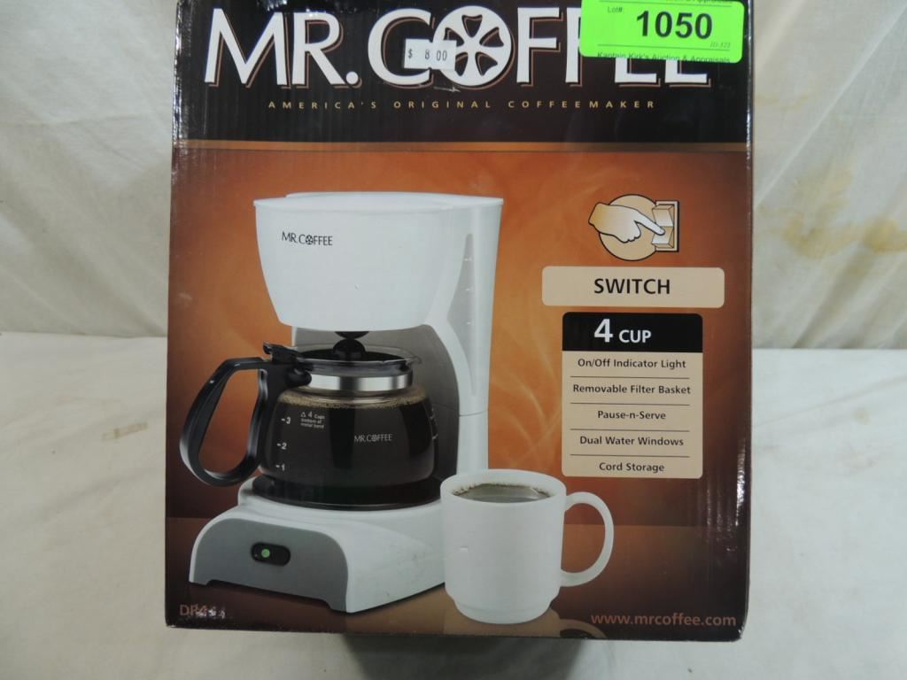 MR COFFEE 4 CUP COFFEE MAKER, ON/OFF SWITCH, REMOVEABLE FILTER BASKET, PAUSE N SERVE, DUAL WATER WINDOWS, CORD STORAGE, KITCHEN ELECTRONICS AS SHOWN SEE PHOTO FOR MORE DETAILS.