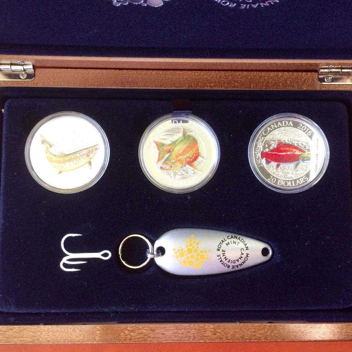 MRC: 2016 Canadian Big Fish 1 oz. Fine Silver 3-Coin Set, C.O.A, Wooden Box, No Sleeve, Tax Exempt.