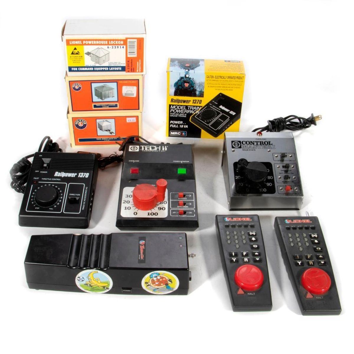MRC 1270 18VA DC Power Supply; MRC Control Master 16VA Power Supply; MRC Tech II Trainpower O-27 Control; Lionel TMCC2 8 VA Power Supply; Lionel CAB-1 Control; Lionel Base-1 and Power supply; Lionel CAB-1 Control; Lionel 6-5906 Sound Activation Button (2 of them); Lionel 6-14178 TMCC Direct Lock; Lionel 6-34120 TMCC Direct Lock; Lionel 6-22914 Lionel Powerhouse Lock