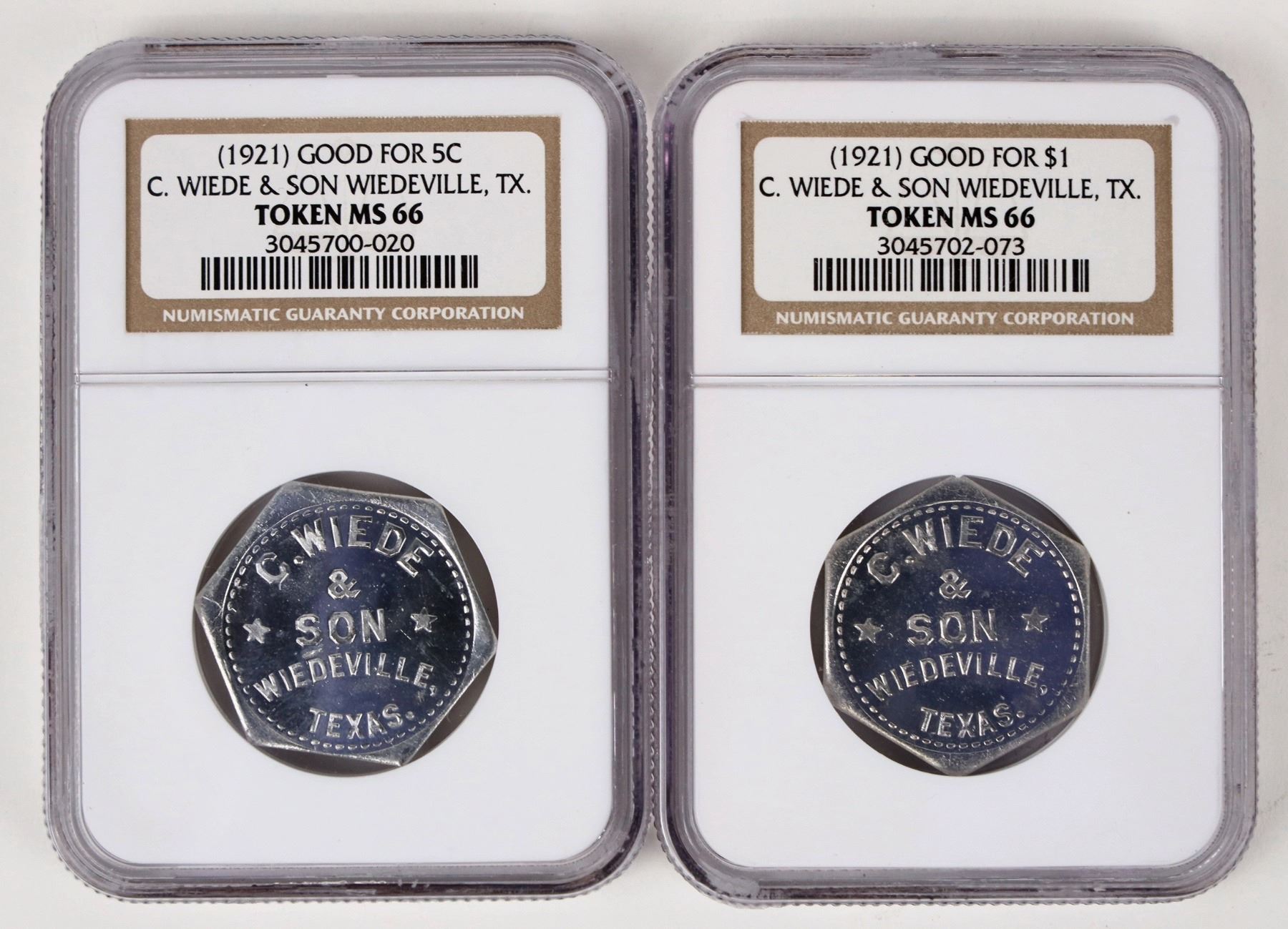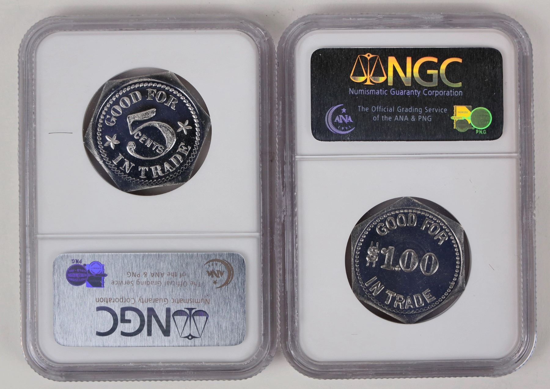Two tokens certified MS 66 by NGC. Good for 5 cents and $1.
