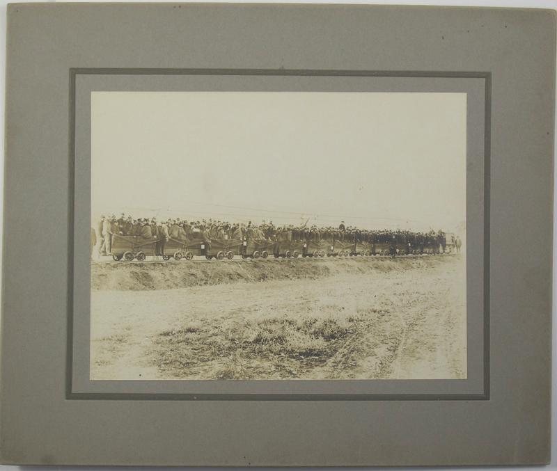 Measures 12’’x 10’’ on grey matte. Medium contrast and focus is sharp. In good condition with very little wear. Top two matte corners are slightly bent. A few small freckle marks are present. Photograph is faded out slightly on the sides. No photographer identified. A group of miners are gathered together in on a series of small ore cars standing idle. No location is given, but looks like it could be from a copper mine in the Mississippi Valley.