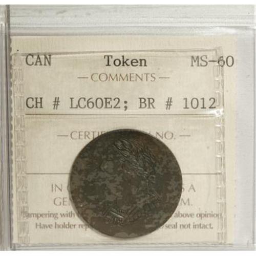 <B>Two ICCS-Certified Breton Tokens.</B></I> Two Breton tokens, <B>B-1012/LC60E1,</B></I> <B>LC60E2</B></I>, both <B>MS60 ICCS</B></I> (International Coin Certification Service). The LC60E1 comes from a T.I.C.F Nov. 15-16, 2002 auction, lot 672.<BR><BR><b>Shipping:</b> Coins & Currency (<a target="_blank" href="http://www.heritageauctions.com/common/shipping.php">view shipping information</a>)