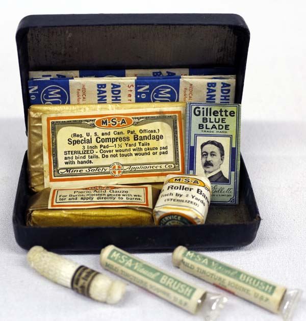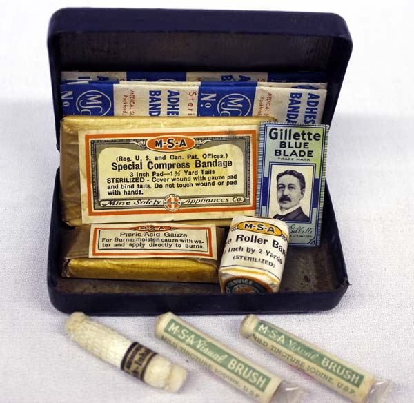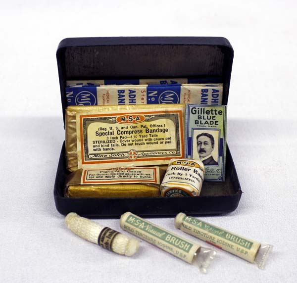 MSA First Aid Kit, measures 4"L x 1.25"H x 2.25"Deep, in a 1930's Gillette Gold Tech Razor Box