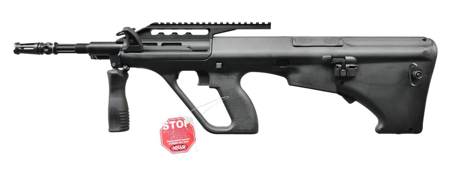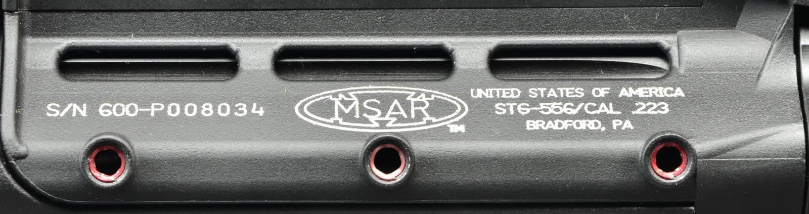 Cal. 223. S# 600-P008034. Bbl. 16". The MSAR is an American mfg. gas operated semi automatic Bullpup, very similar in aesthetics to the Steyr AUG. In true Bullpup fashion, the operator has the ability to utilize a long bbl. to take advantage of available ballistics w/ out sacrificing negative aspects of having a full-sized rifle. Due to the placement of the action, which is under the cheek of the shooter, the bbl. extends forward from that point, where it is typically above the trigger creating a much smaller signature. The stock or chassis is black molded plastic. Small section of the bbl. that is actually exposed is a combination of flutes & microgrooves for expedient cooling by increasing the surface area. Muzzle brake is a proprietary design, often referred to as a tulip. 7 1/2" Numbered picatinny rail section above trigger for optic mounting. Like all MSAR designs, it includes a retractable vertical pistol grip. Microtech Small Arms Research started production in 2005 & continued until 2015. They are now continuing their popular knife line. MAGS: none. CONDITION: all outward appearances indicate this firearms is in new or as new condition. Still retains factory safety hang tag on trigger guard & factory muzzle cap. Finish is complete w/ full coverage still enjoying its factory matte black appearance. Bore is shiny w/ good rifling & fire control group appears to function correctly when cycled by hand. (22-255/JZ). MODERN. $1,000-1,500.