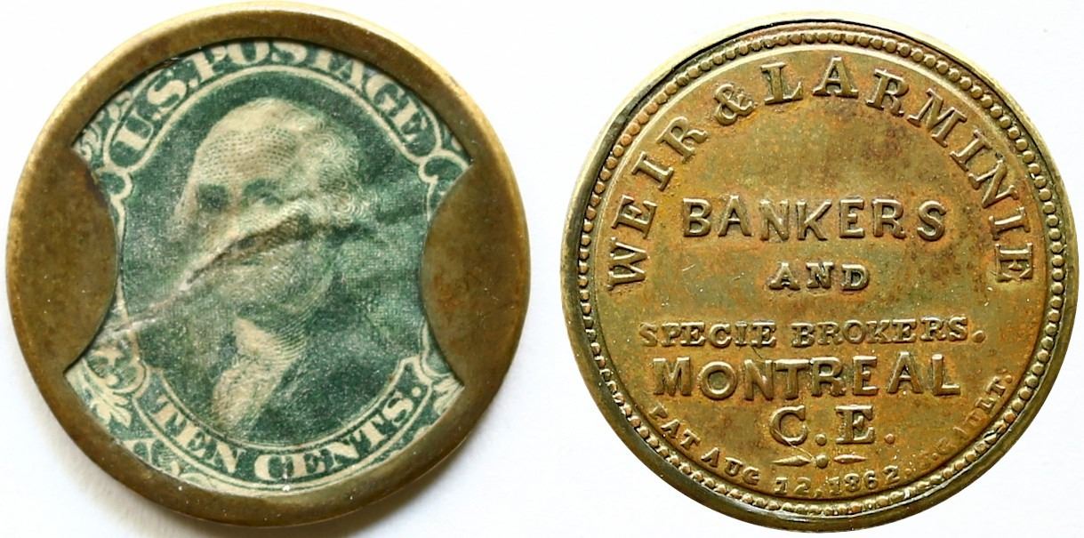 MT-7, Breton 568 - 1862 Weir & Larminie Encased 10 Cent Token. A magnificient piece from the unique Canadian series of encased stamp tokens by the famous Weir & Larminie bankers and specie brokers from Montreal. About VF or better.
