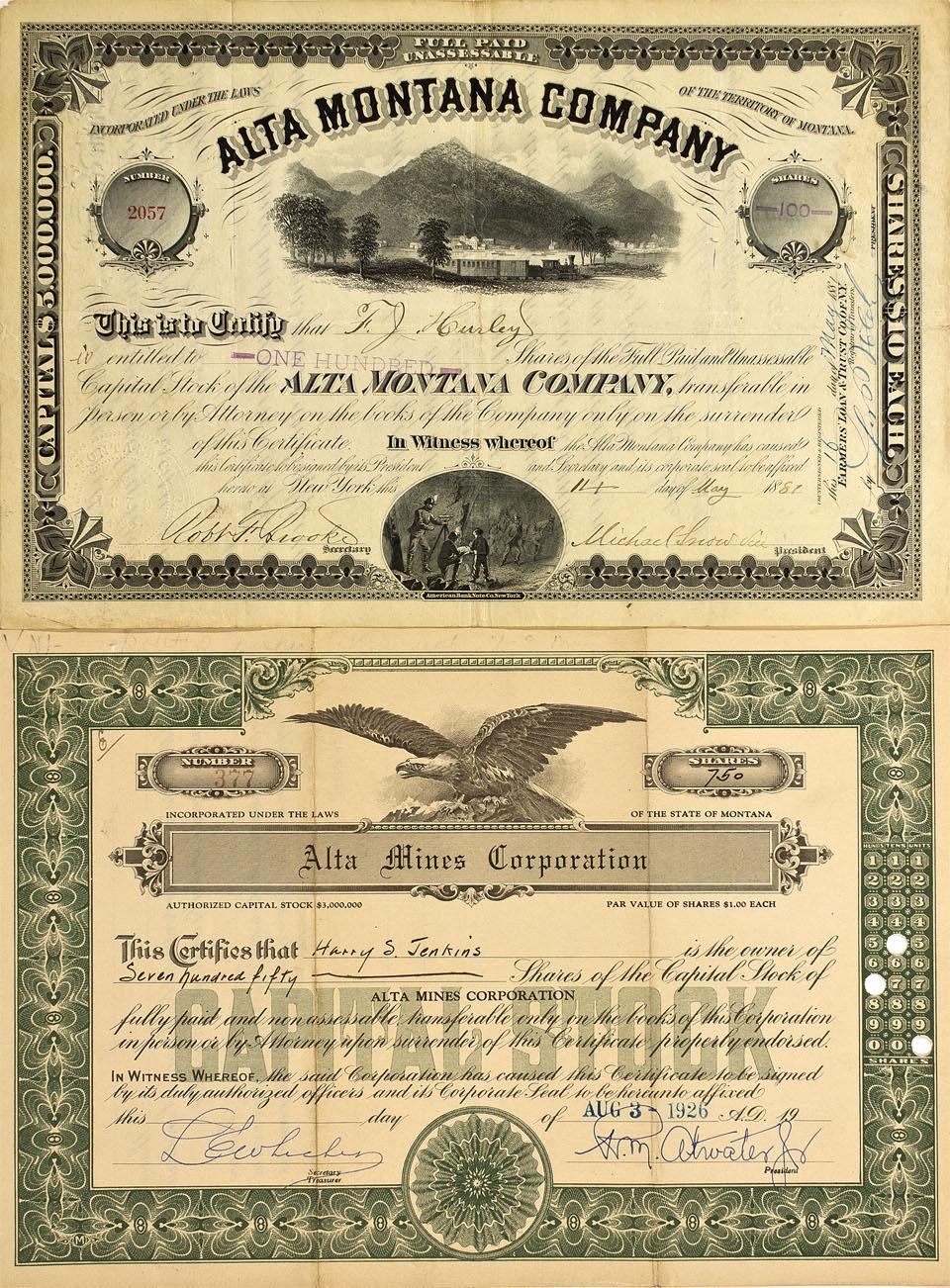 Lot of 2. 1)The Alta Montana Company owned the Alta Mine which was an abandoned hardrock silver mine located outside of Corbin. It was incorporated in 1879 in Montana Territory. Shortly after the ore body at the Alta Mine was discovered in 1869, the property was sold to the Alta Montana Company. In 1883, the property was purchased by the Helena Mining and Reduction Company (also known as the Helena and Livingston Smelting and Reduction Company) which operated the mine until 1896. During operation of the mine by the Helena Mining and Reduction Company, between 150 and 200 tons of ore were mined per day. At the same time, a concentrator was constructed in Corbin, approximately 1.5 miles northwest of the Alta Mine. In 1896, all mining operations at Alta ceased [http://ecorestoration.montana.edu/mineland/histories/metal/alta/default.htm]. This is certificate number 2057 for 100 shares issued to F. J. Hurley and signed by Robr. F. Brooke and Michael Snow, vice president, May 14, 1881. Black decorated border. Vignette of port town at foot of hill with steam train passing in foreground at top center and one of an underground mining scene at bottom center. 2) The Alta Mines Corporation includes a group of claims 2 mi southwest of Corbin, Montana. This silver mine was owned or leased by a series of at least eight mining companies between 1883 and 1923. The mine was develooped by a 682' shaft and tunnels of about 1,300'. This company was incorporated on May 9, 1924. It bought the Alta Corbin Mines Co., a later reincarnation of the Alta Montana Co. (Information from The Mines Handbook, 1931.) This is certificate number 377 for 750 shares issued to Harry S. Jenkins and signed by L. E. Whicher and R. M. Atwater, Jr., Aug. 3, 1926. Green decorative border with black text and a vignette of an eagle with outstreached wings.