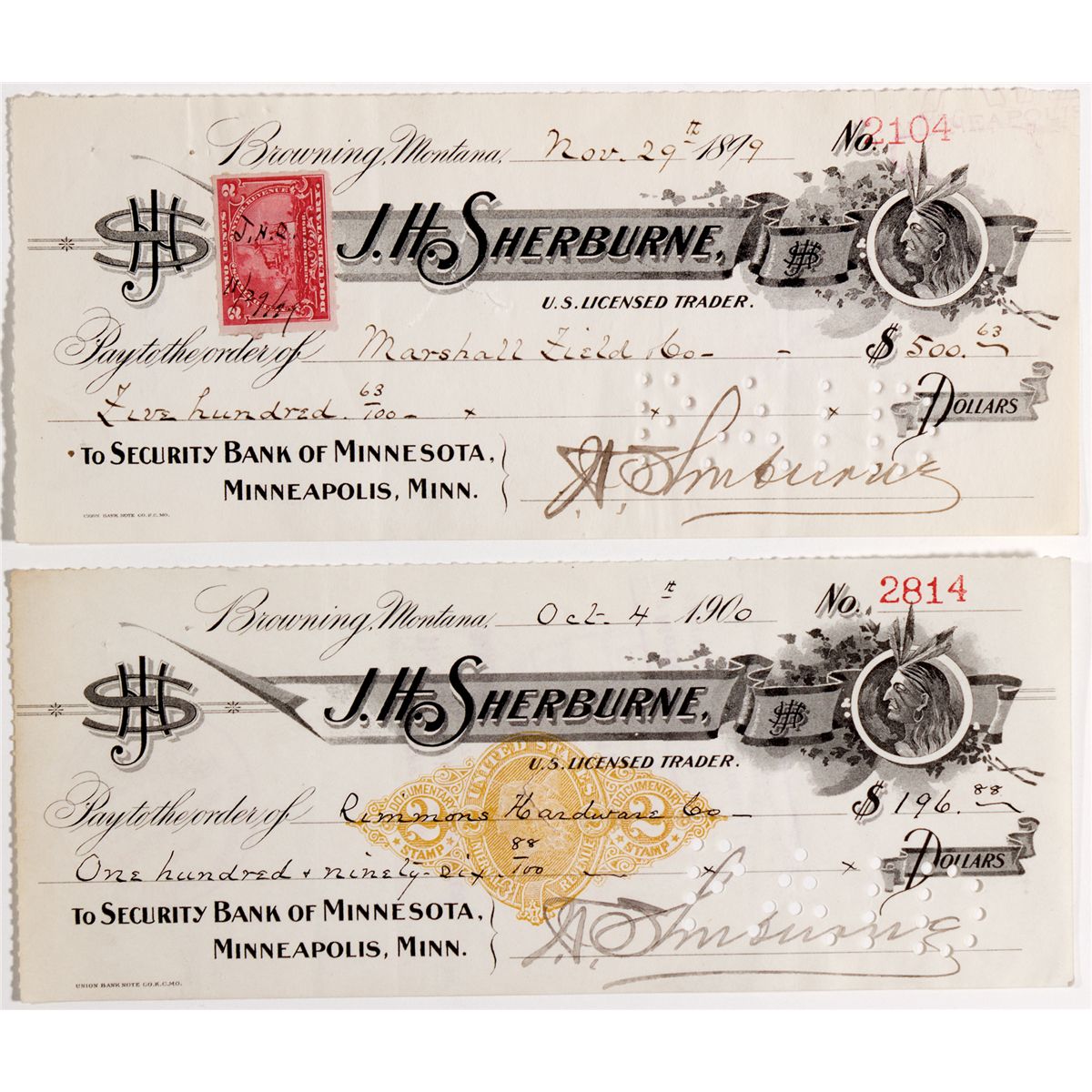Lot of 2 checks. 1) Check #2104 is dated November 29, 1899, issued to Marshall Felid for $500.63. Measures 7.70” x 3.25”, has some wear. A 2 cent red revenue stamp is located on the front. Cancelled. 2) Check #2814 is dated October 4, 1900, issued to Rimmons Hardware Co. for $196.88. Also measures 7.70” x 3.25”, has some wear. Cancelled. - Vinegar Collection