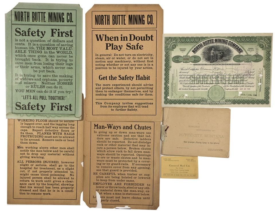 Lot of 7 items including: 1) North Butte Mining Company Stock, incorporated under the laws of the State of Minnesota. Cert. No. 61136, datelined June 28, 1910. Issued to Florence W. Wells for 20 shares. Signed by (illegible) as President and Secretary. Hydraulic mining vignette at center top with ornate green border and embossed seal at center bottom. Stamped cancelled at far right. Printed by American Bank Note Company, New York. Very fine. 2) North Butte Mining Co. Man-Ways and Chutes Safety Broadside. Measures 8" x 12", with each missing at least one of their corners, probably due to being removed after posting. Primary topics include "Safety First," "Man-Ways and Chutes," "When In Doubt Play Safe," and Working Floor Rules." 3) North Butte Mining Co. "When in doubt play safe" broadside. Same size as above. 4) North Butte Mining Co. "Safety First" Broadside, printed on green stock. Same size as above. 5) North Butte Mining Co. Floor Hazards Broadside. Same size as above. The above 4 broadsides are printed on a thick cardstock, but are fragile. They date from the approximate 1900-1915 period. 6)Indelible Photographs of Butte City, Montana. The Greatest Mining Camp in the World, The Albertype Co., New York. Copyright, 1891, by Moore & Sipple, Photographers, Butte City, Montana (not listed in mautz). Softcover, 16 pages, with front cover missing. Virtually all images, no text, measures 7" x 5". 7) Card for the Commercial Hotel Café, located in Elko, Nevada. Related locations of "Totem" Café in Dillon and West Yellowstone, MT.