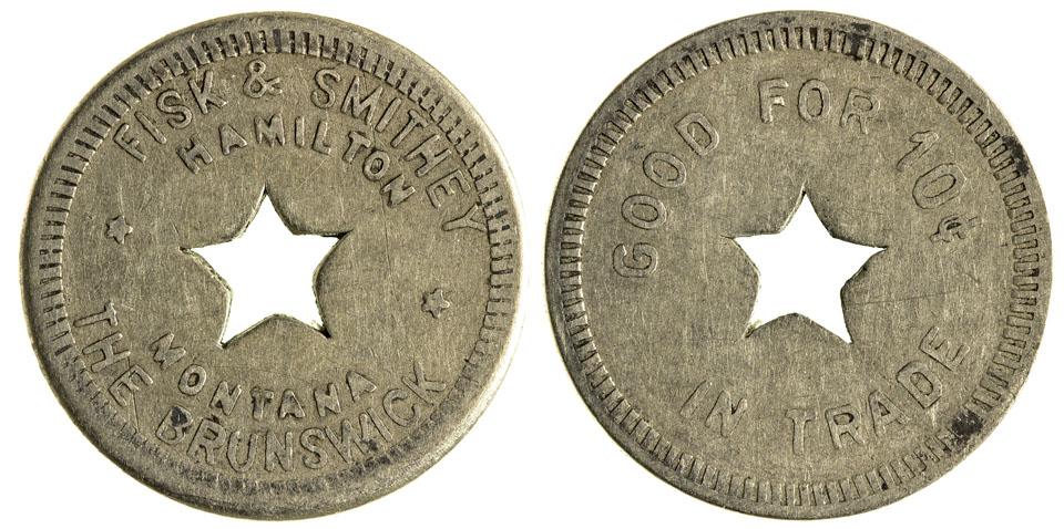Obverse: Fisk & Smithey / Hamilton / Montana/ The Brunswick; reverse: Good For 10c / In Trade.