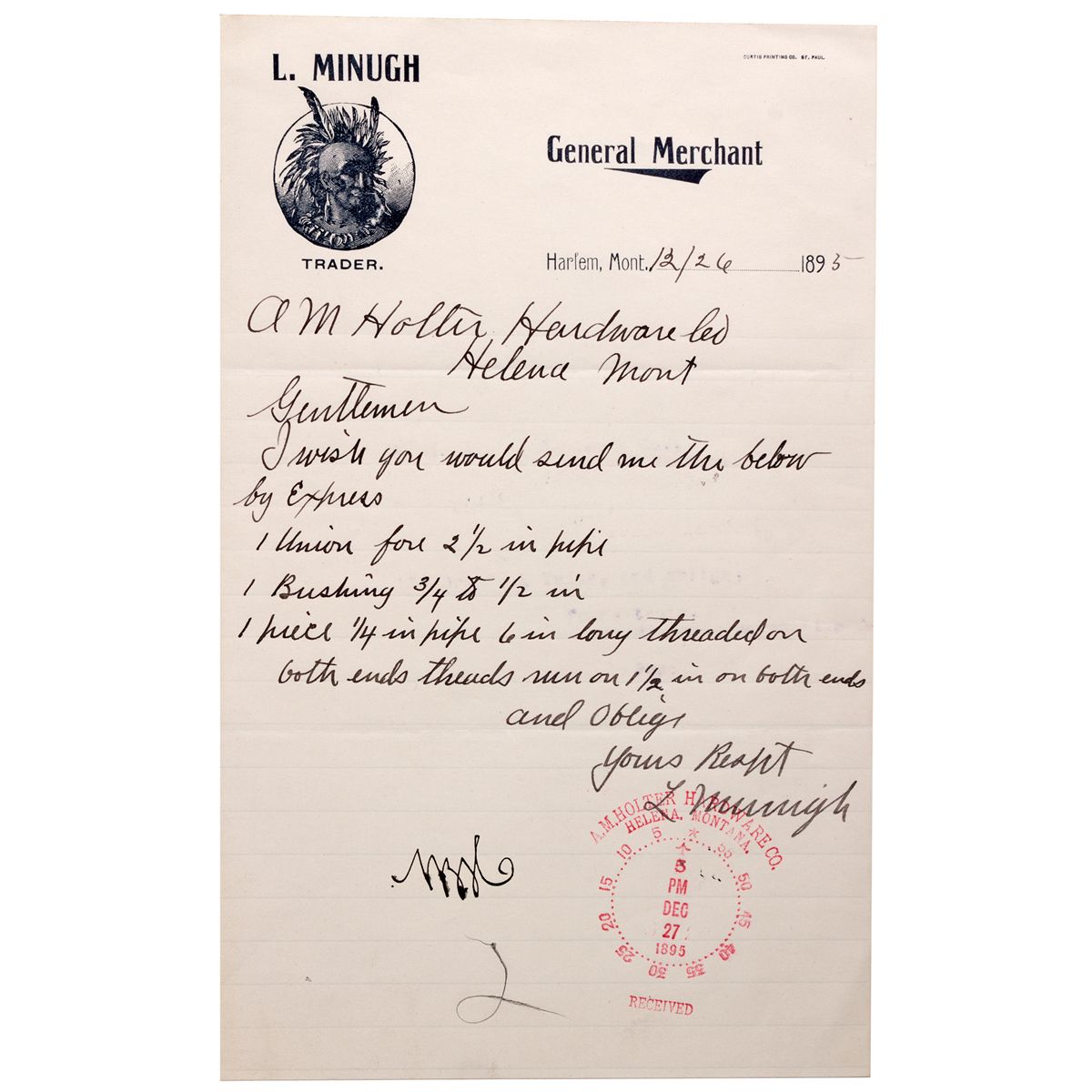 Measures 9.45”x 5.40” printed on white paper. There is very little wear, expect for minor creases. There is an image of a Native American man on the upper left corner with the words “L.Minugh Trader. General Merchant” around the image. Letter is dated 12/26/1895 and was sent to A.M. Holter Hardware Co. in Helena. The letter describes a list of hardware items and goods to be sent by express. - Vinegar Collection
