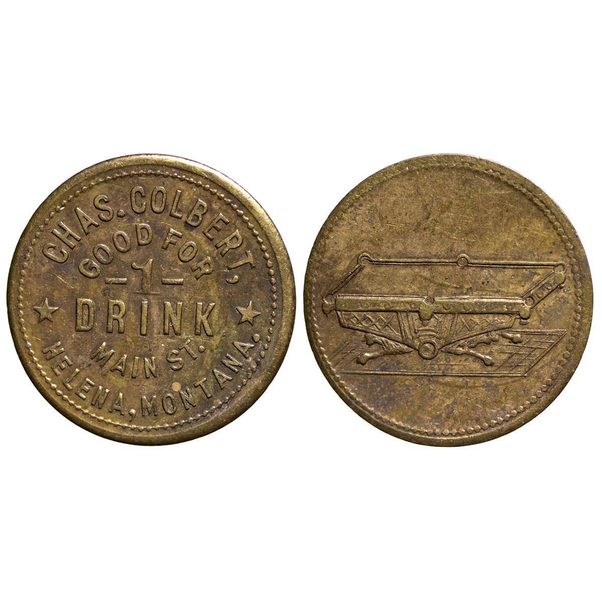 Obverse, GF 1 drink. Main St. Reverse, pool table pictorial. Territorial. Very fine.