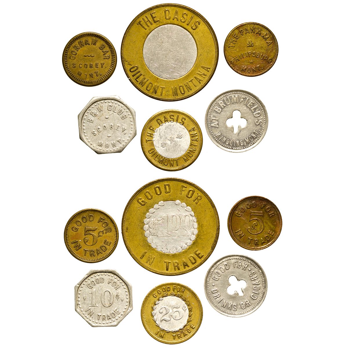 Lot of 6: 1) Oilmont, Oasis. GF25cIT. Fine. 2) Oilmont, Oasis. GF$1IT. Fine. 3) Philipsburg, Panama. GF5cIT. 4) Scobey, B & W Club. GF10cIT. 5) Scobey, Gorham Bar. GF5cIT. Fine. 6) Ringling, Brumfields. GF1 drink or cigar. XF. Ringling is named for the circus family, Ringling Bros., specifically for John Ringling who owned significant ranchland in the area where the town sprang up. Nearby White Sulphur Springs, the county seat for Meagher County, was the site of a natural hot springs that John Ringling bought for development [Sanders, 1913].