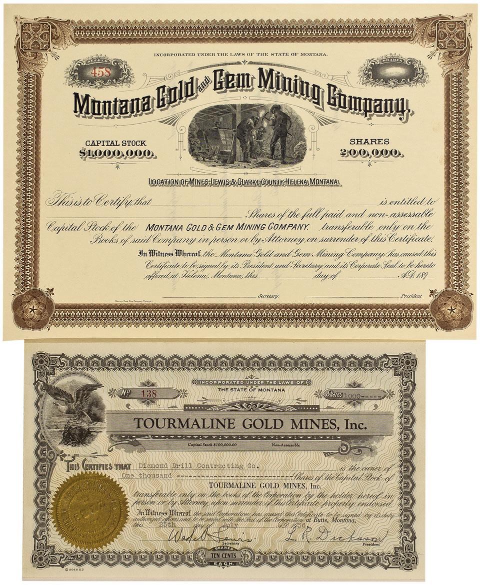 Lot of 2. 1) Montana Gold and Gem Mining Company unissued certificate Number 458. Located in Helena, Lewis and Clark County. Brown decorated border with black text and vignette of 4 underground miners in top center. 2) Tourmaline Gold Mines, Inc. Certificate No. 138 for 1,000 shares issued to Diamond Drill Contracting Co. and signed by Wad. N. Lewis and L. R. Dickason, July 25, 1956. Incorporated under the laws of Montana. Datelined Butte, Montana. Black decorated border with gold sunburst-lines in background. Mines located in Elkhorn, Jefferson County.