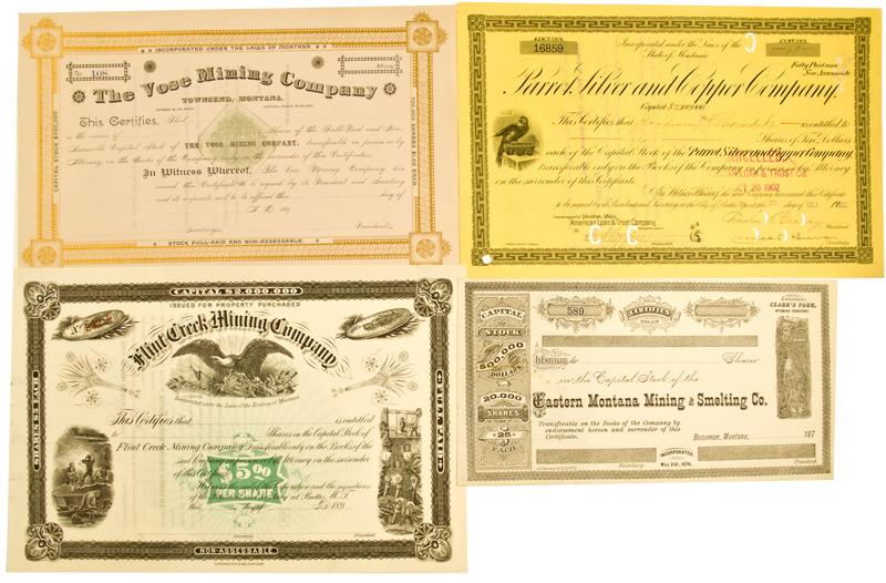Lot of four. 1) Vose Mining Co. No. 108 Unissued. Grn. And blk with gold on crème. 11.5" x 7". 2) Eastern Montana Mining and Smelting Co. Incorporated May 23, 1876. No. 589 unissued. Blk on crème. 10" x 5.25". 3) Parrott Silver and Copper Co. Incorporated in Montana. No. 16859 issued Oct. 10, 1902. Signed by Charles Dickey, Pres. Cancel punches through signature. Vignette of parrot at left. Blk on yellow. 11.25" x 7.25". 4) Flint Creek. Mining Co. Incorporated in Montana. No. 8924 unissued vignettes of miners, eagle with shield and coins. Blk/grn on crème. 11.5" x 7.75."